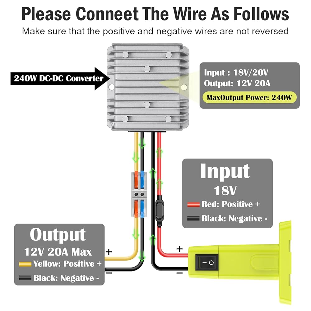 Important Note: This 18V to 12V step down is not a charger, it only outputs the voltage and power directly from your battery. When using, make sure that the positive and negative wires of your device correspond to the positive and negative wires of the voltage converter adapter. If not used for a long time, please be sure to remove the battery form the adapter. (This converter set Battery NOT Included)