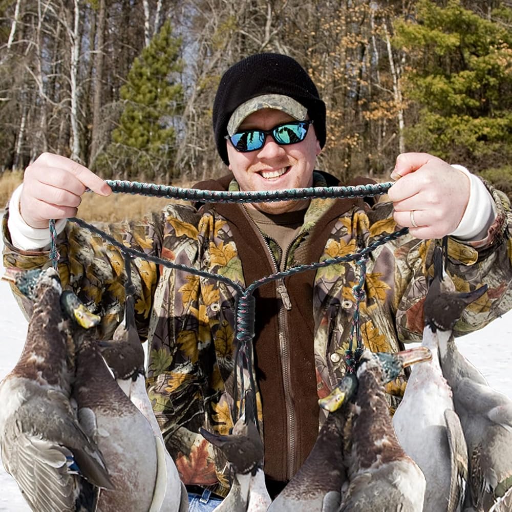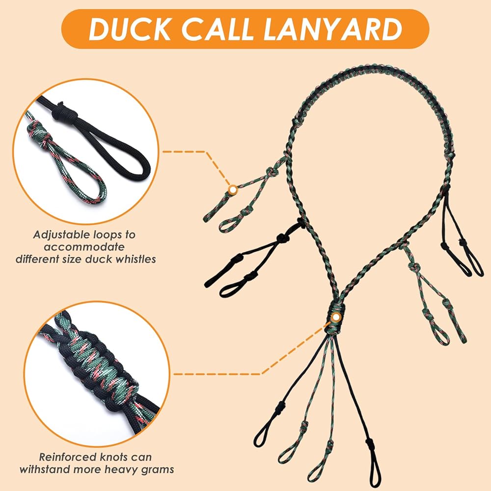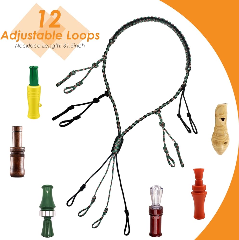 HOLDS 12 DUCK CALL SECURELY: Game call lanyard has 12 adjustable loops to hold accessories needed for hunting, different sizes of hunting whistles and preys. And it can protect duck calls from falling into water and mud. The paracord has 31.5inch long and 0.9inch wide, fits most necks
