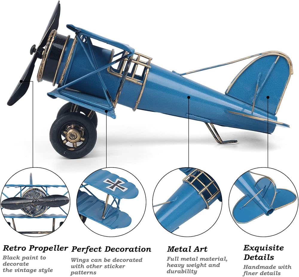 صناعة يدوية معدنية رائعة - هذه الزينة العتيقة للطائرة مصنوعة من مادة معدنية فاخرة بنسبة 100%، والتي ليس من السهل أن تتآكل، ومناسبة للديكور والجمع على المدى الطويل. براعة يدوية رائعة وملمس ناعم. يستعيد بشكل أساسي مظهر طائرات الحرب العالمية الثانية، وتم طلاء السطح لتقليد الطراز العتيق ويضيف لمسة ريفية إلى الديكور.