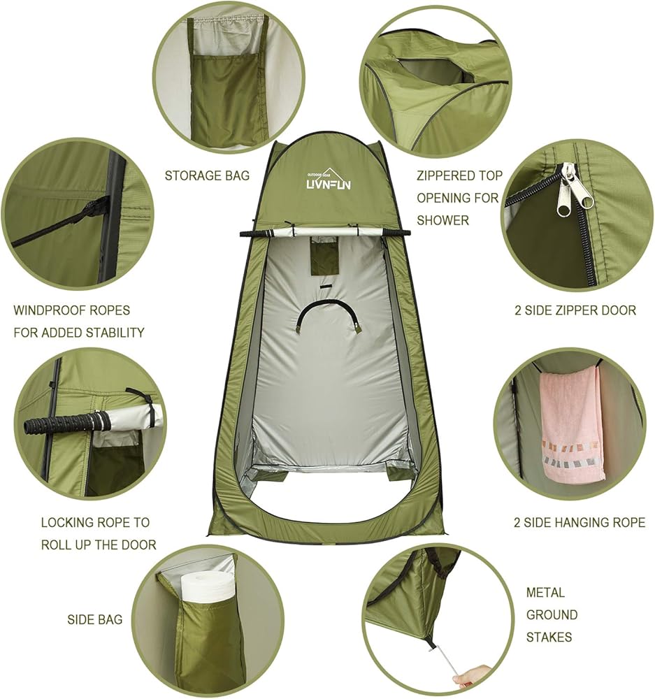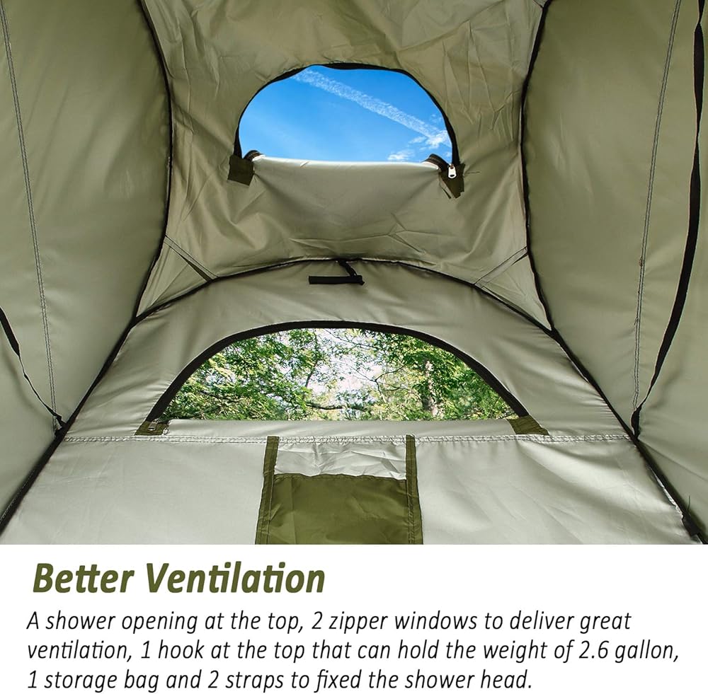 • تصميم مبتكر - فتحة دش في الأعلى، وخطاف واحد في الأعلى يمكنه حمل وزن 2.6 جالون. 2 شريط لتثبيت رأس الدش. 2 نافذة بسحاب لتوفير تهوية رائعة. حقيبة تخزين واحدة، وحقيبة جانبية واحدة، و2 حبل غسيل لتلبية احتياجاتك اليومية في البرية. تصميم باب كبير بسحاب مزدوج الفتح لتوسيع أفقك ومريح للدخول والخروج. تصميم بدون أرضية يحافظ على نظافة خيمة الدش