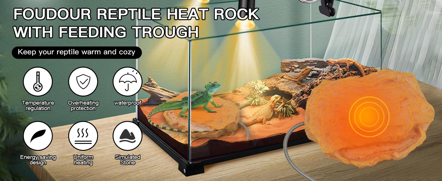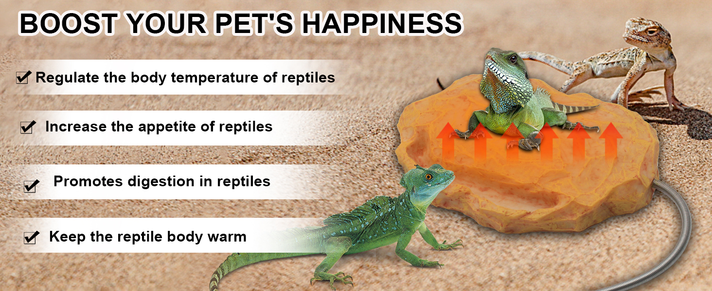 مناسبة لمعظم الزواحف - تحاكي صخرة تسخين الزواحف الحجر الذي تسخنه الشمس، بما في ذلك الليلية، تستخدم معظم الزواحف هذا النوع من الحرارة الموصلة للتنظيم الحراري، مثل التنانين الملتحية والسحالي والأبراص والثعابين والسلاحف والنسك والسلاحف والحرباء والإغوانا. مثالية أيضًا للزواحف التي تتناول وجبات كبيرة.