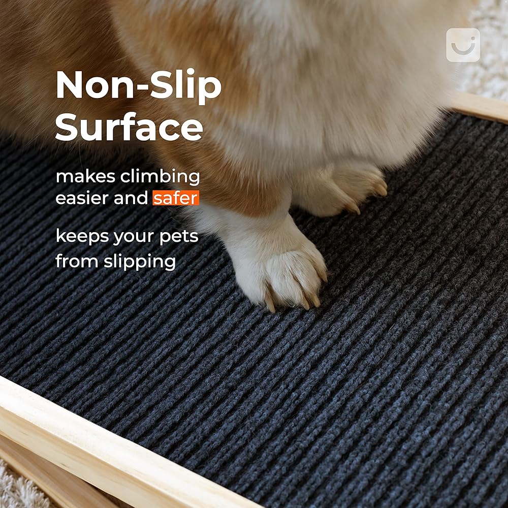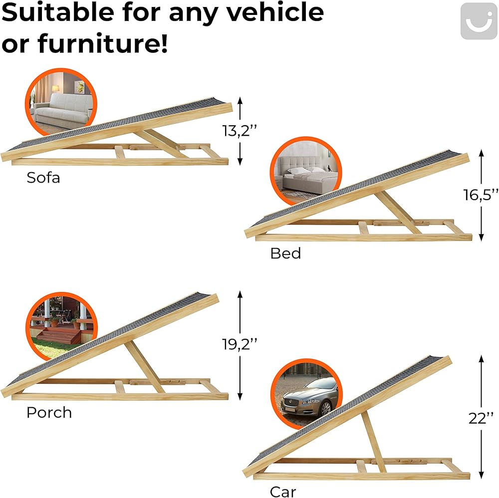 قابل للتعديل – لم يكن من السهل على حيواناتك الأليفة الوصول إلى أماكنهم المفضلة! يتميز منحدر الكلاب الخشبي هذا بـ 4 ارتفاعات قابلة للتعديل، لذلك يمكنك وضعه في أي مكان. استخدم منحدر الكلب للسرير أو الأريكة أو السيارة - الأمر متروك لك!