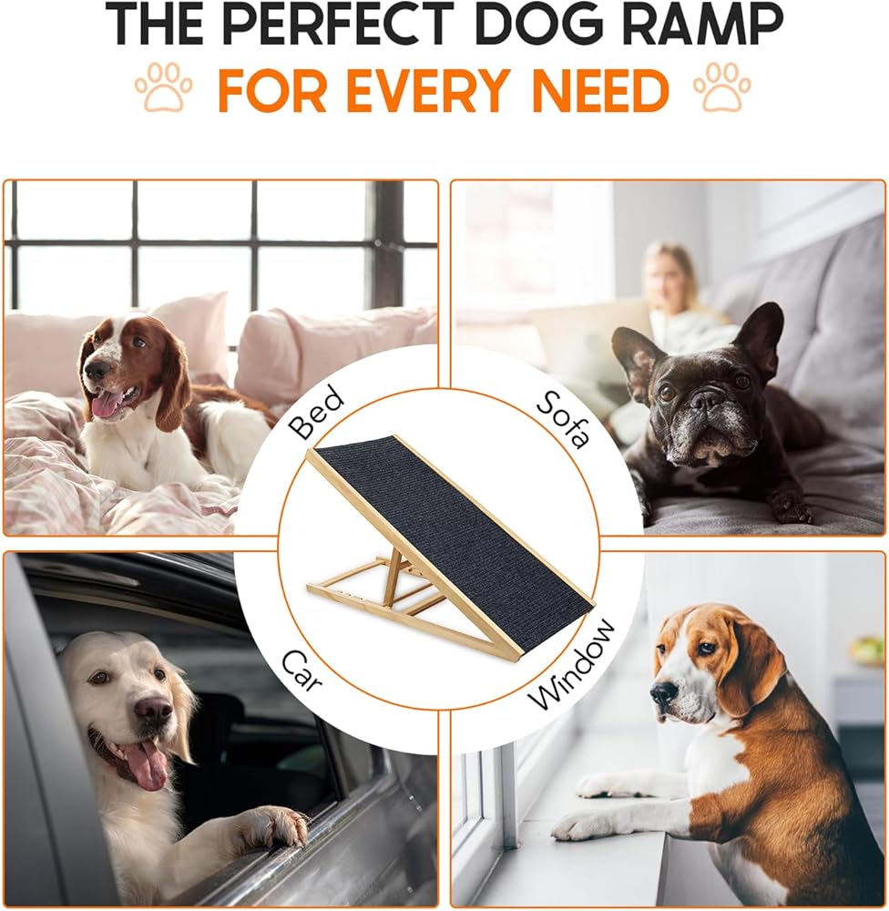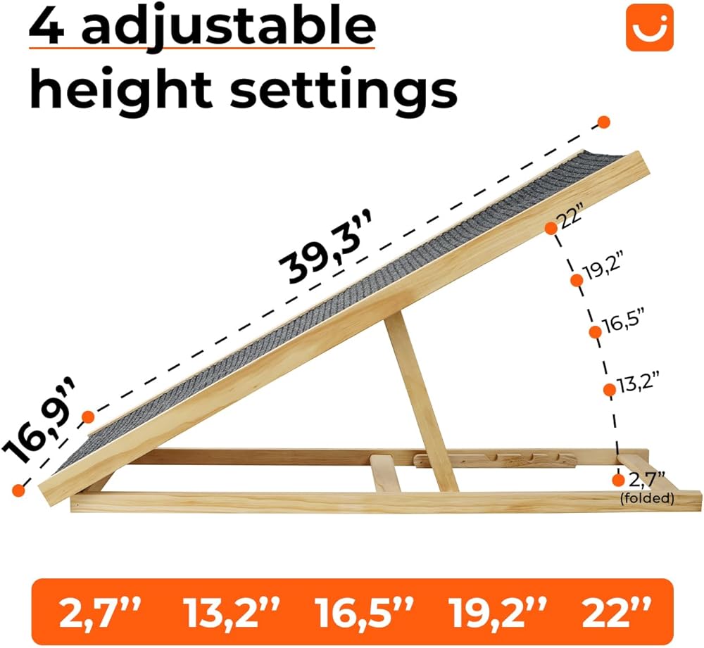منحدر كلاب قابل للتعديل لسرير الكلاب الصغيرة - 4 مستويات ارتفاع من 13.2 انش الى 22 انش - منحدر خشبي قابل للطي للحيوانات الاليفة - مناسب للكلاب والقطط القديمة - منحدر للحيوانات الاليفة للسيارة والسرير