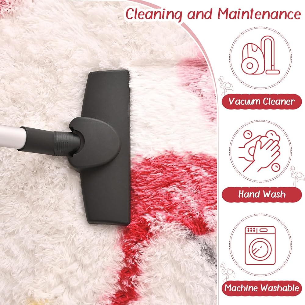 سجادة سهلة التنظيف وقابلة للغسل: للتنظيف الخفيف، ما عليك سوى هزها ثم النقر عليها، أو رش المنظف ومسحها؛ أو استخدم المكنسة الكهربائية ذات الوضع اللطيف؛ للتنظيف العميق، تُغسل السجادة اللطيفة يدويًا أو يمكن غسلها في الغسالة. يرجى التأكد من التجفيف بعد الغسيل حتى تعود سجادة الفلامنغو إلى حالتها الطبيعية.
