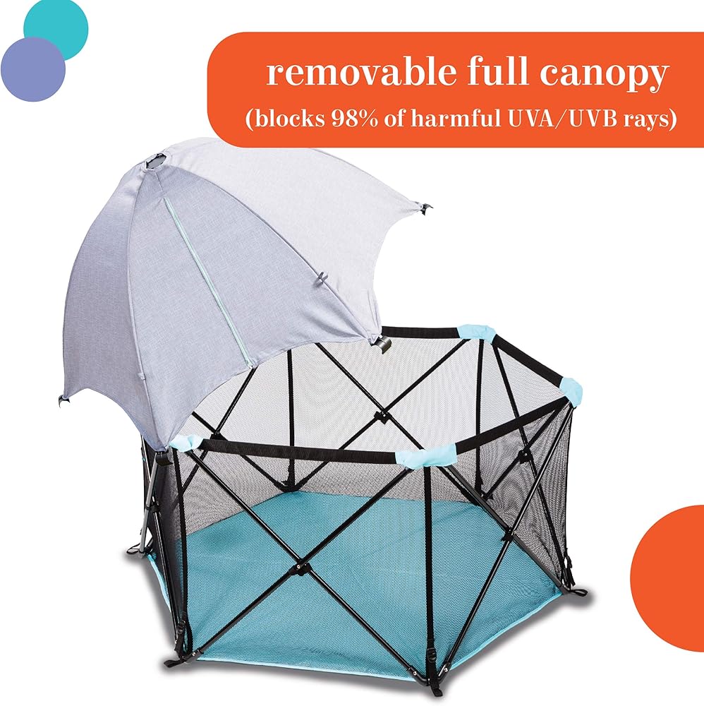 The Summer Pop ‘n Play Portable Playard allows you to easily create a safe portable play area for your child. The ultra-lightweight and compact fold playpen can be set up and taken down in seconds, making it perfect for use at home, a day at the park, or a weekend at the beach. The water resistant floor helps keep baby dry even on damp grass. Airy mesh sides provide added visibility. A travel bag with shoulder strap is included for on-the-go convenience.