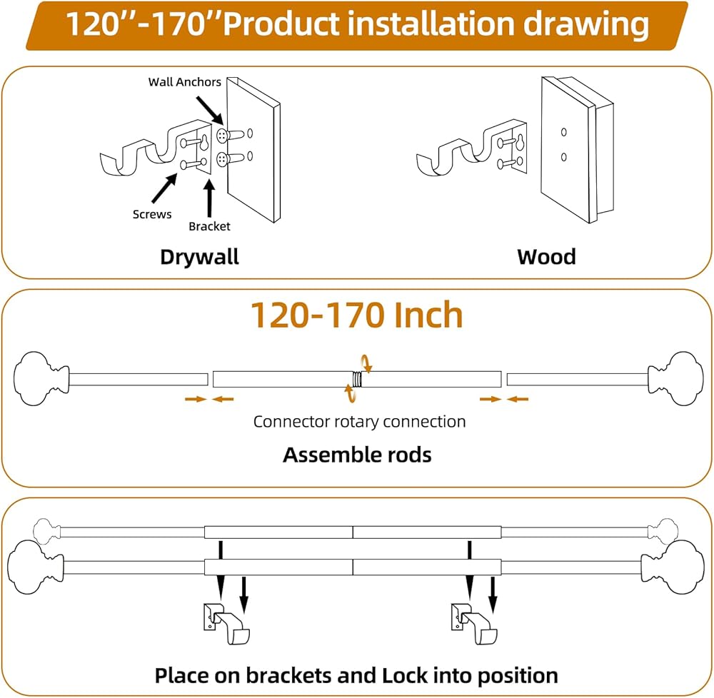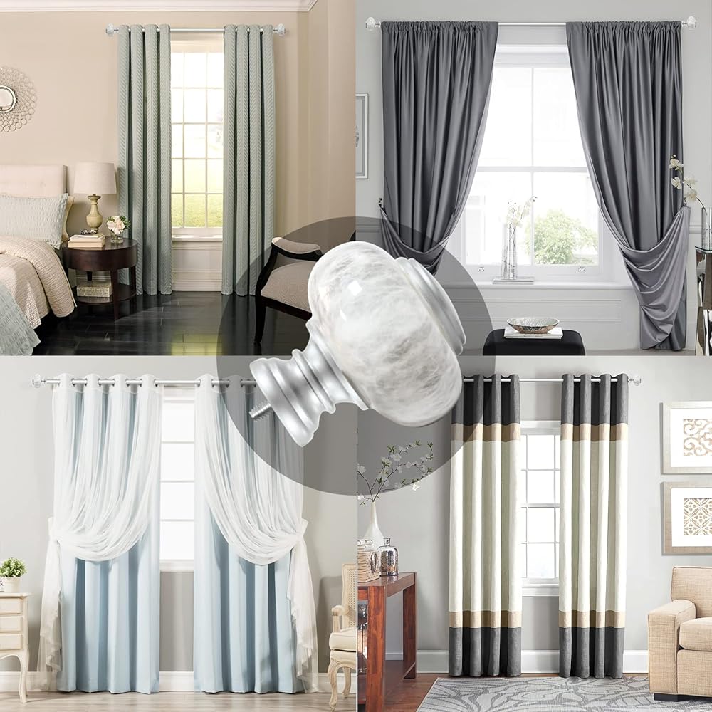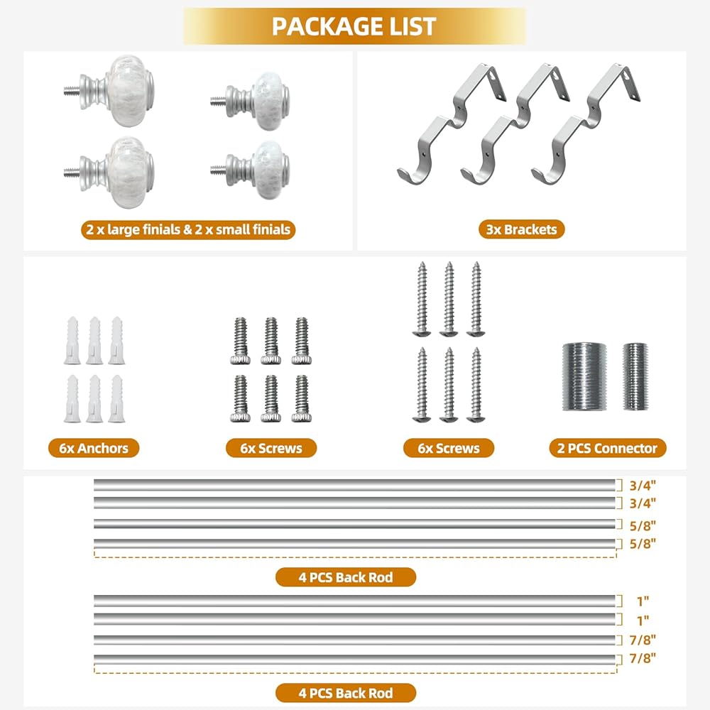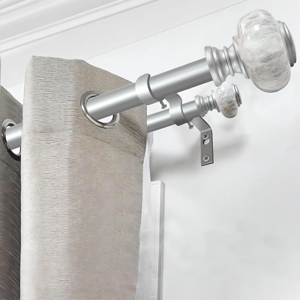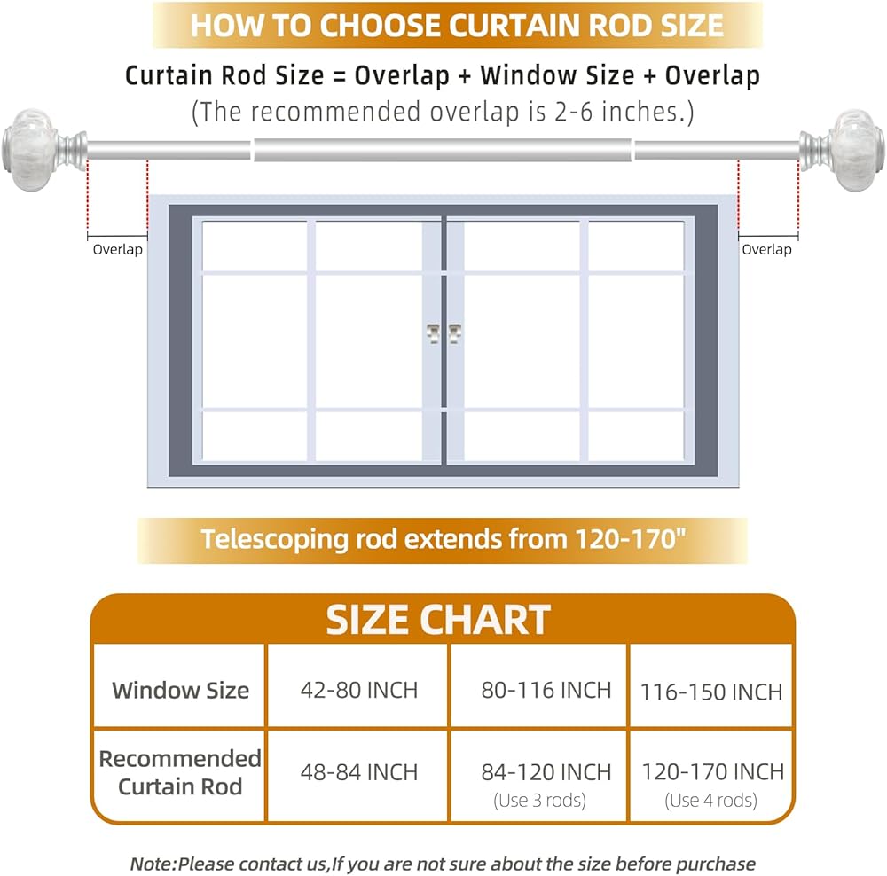 Double Curtain Rod Set Includes: Installation Instructions, 84-120"Double Curtain Rod Silver, 3 Double Curtain Rod Brackets Silver, 6 White Marble Finials, Available in 2 Sizes, Rods Available in 48 to 84" 、84 to 120" and 120 to 170"inter-regulation Modern Design and Beauty: Complete Modern Treatment Decorative Window Hardware Curtain Rod. Each rod is treated with a high-tech baking paint process, which is particularly beautiful and durable. Silver with your favorite curtains. Heavy Duty and Strong: Heavy duty curtain rods measure 1" diameter outer rod and 7/8" inner rod, 5mm reinforced metal rod thickness and can withstand 30 lbs. This means that this research curtain rod can be used with most curtains of all thicknesses, such as lanyard curtains, clip-on light curtains, drapes, etc. EASY INSTALLATION: If you are not installing a curtain rod for the first time, it is completely under your control. For first-time users, we provide the installation instructions needed to get started quickly and easily. Be sure to remember this: safe after-sales service, if you have any questions about the curtain rod set, please don't think too much, contact us immediately, we have assured after-sales service to escort you