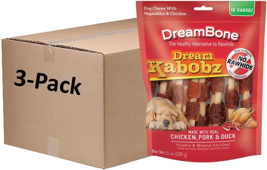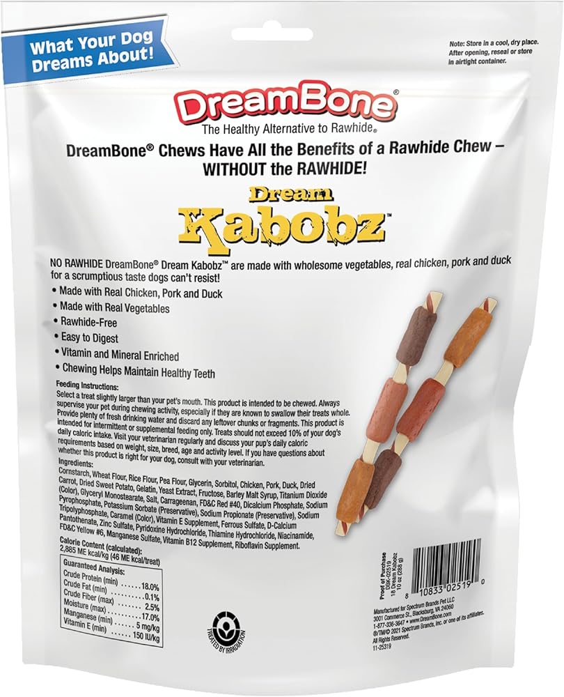 DreamBone chews have all the benefits of a rawhide chew without the rawhide. No-rawhide DreamBone chews are made with real chicken, beef, bacon and cheese or sweet potato and wholesome vegetables for a scrumptious taste dogs can't resist! No-rawhide DreamBone Medium Chews for dogs are made with real beef, chicken and wholesome vegetables for an irresistible taste dogs dream about. Enriched with vitamins and minerals, these chews are a healthy alternative to rawhide. Treat your pup to these highly digestible and 100 percent delicious chews. DreamBone Medium Chews promote healthy teeth and gums through the natural action of chewing, making them a treat both you and your dog can love. Give your dog 1 to 2 DreamBone Medium Chews per day. Always supervise your pup during chewing activity and provide access to fresh, clean water. These chews are intended for intermittent or supplemental feeding only. Store in a cool, dry place. After opening, reseal or store in an airtight container to preserve freshness. The experts at DreamBone brand want you to have healthy, happy dogs. We know that your dog is more than a pet – they're family. Chewing is an essential, healthy and enjoyable activity for dogs. Dog chews help keep teeth clean, jaws strong and are mentally stimulating to help prevent boredom and destructive behavior. DreamBone chews help satisfy a dog's natural chewing instinct.