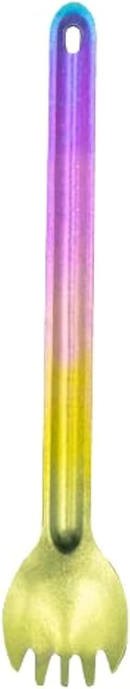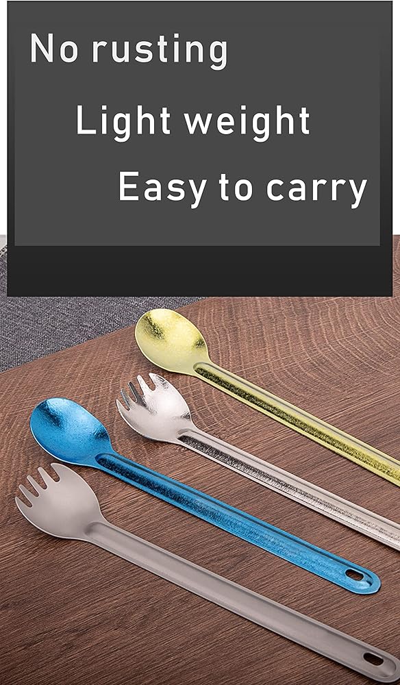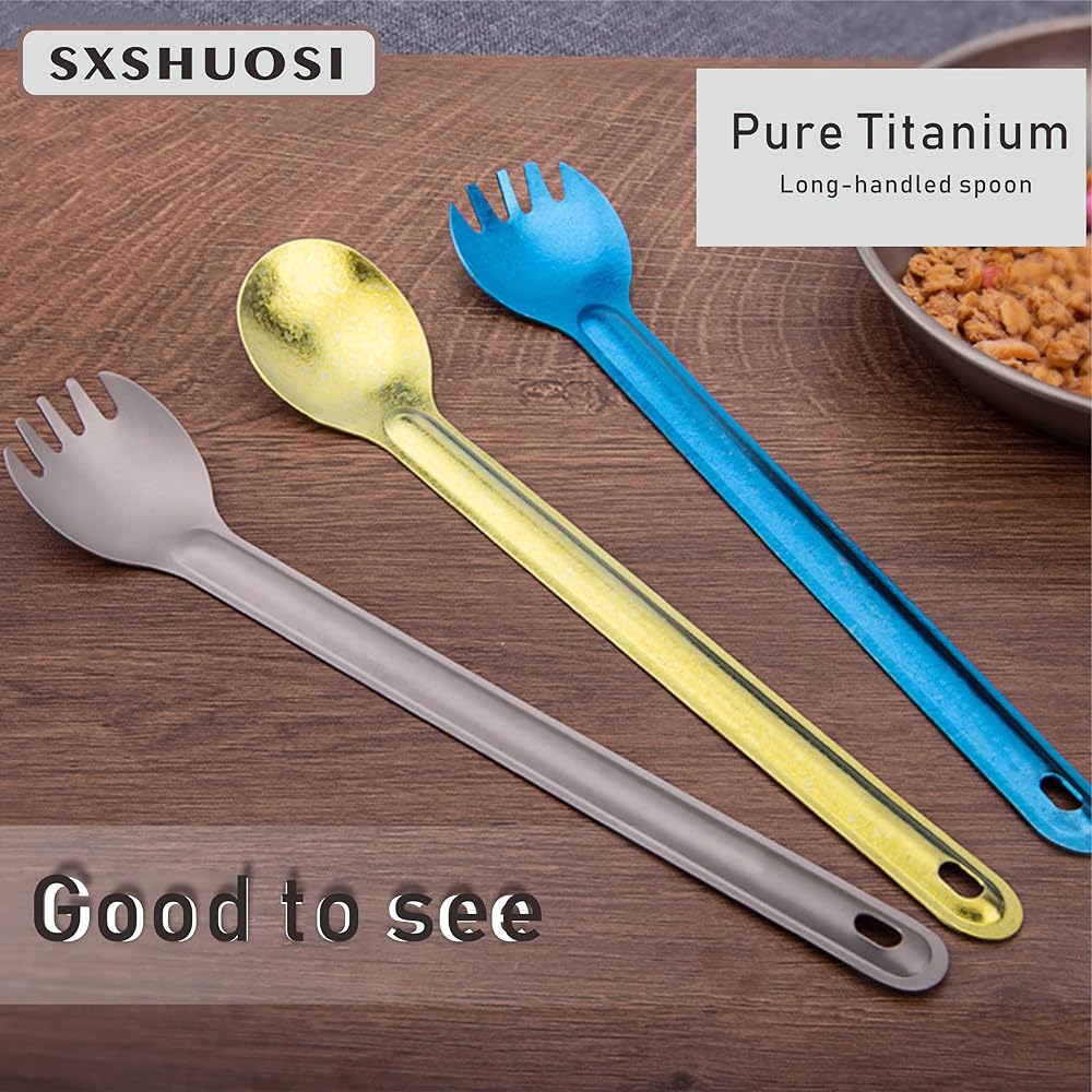 HUOSI Technology has been focusing on providing and designing the best quality products for global customers. This pure titanium long handle spork is your high-end companion for home and travel, 100% food grade, lighter than other material spoons, and has a longer service life. All the colors of titanium forks and spoons are formed by the changes in the physical structure of the titanium material after thousands of degrees of high temperature. The surface is bright and durable, and it is not easy to fade. Great for family gatherings, travel, hiking, camping and the outdoors, and your #1 choice for gift giving.This product is made of food-grade titanium, it is a spoon that also has the function of a fork, beautiful and easy to use!
