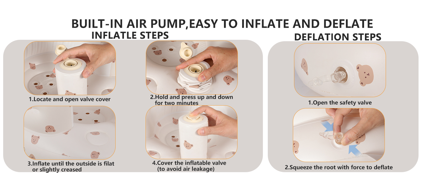 【آمنة مع مضخة مدمجة】فقط اضغط لأعلى ولأسفل على مضخة الهواء المدمجة لنفخ الكرسي بسهولة دون أدوات أخرى. سهلة النفخ أو التفريغ، مع حقيبة تخزين، يمكن أن تكون مكانًا مؤقتًا للأطفال في أي وقت وفي أي مكان. المقعد الأرضي للأطفال مناسب للرضع من مختلف الأعمار والأحجام