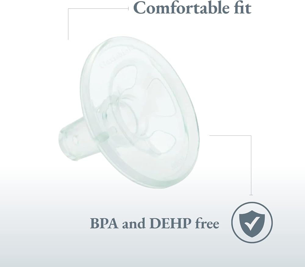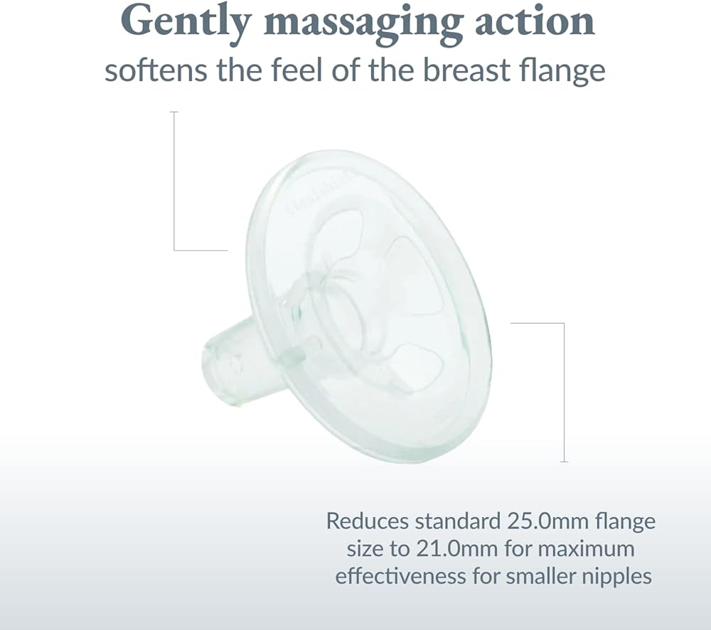 محفزات فليكس شيلد من اميدا هي حشوات سيليكون مريحة تناسب حواف الصدر القياسية مقاس 25.0 ملم. عند إدخال فليكسيشيلد يحاكي شعور فم طفلك، ويساعد على تحفيز رد الفعل ويقلل من حجم الحافة إلى 21.0 ملم لتحقيق أقصى قدر من الفعالية للثدي الأصغر. لا يحتوي محفز فليكسيشيلد على البيسفينول ايه أو DEHP. المزايا