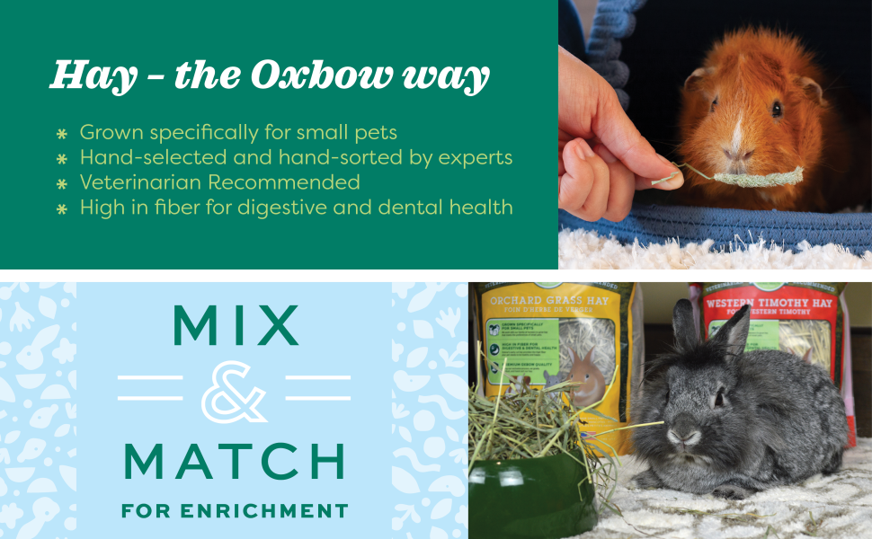 At Oxbow Animal Health, our purpose is to help people and pets live happy, healthy lives. For more than 30 years, we've partnered with leading veterinarians and nutritionists to develop nutrition and care products that meet the specific species and life stage needs of rabbits, guinea pigs, chinchillas, hamsters, gerbils, rats, and mice. From farm fresh hays and nourishing fortified foods to wholesome treats, beneficial supplements, enrichment and care, Oxbow products are used and recommended by leading veterinary professionals and passionate pet parents worldwide. Oxbow's all-natural Western Timothy Hay is a nutritious, sweet-smelling grass that will stimulate the appetite of your rabbit, guinea pig, chinchilla, or other small pet. Western Timothy is the #1 vet-recommended hay for small herbivores. FEEDING INSTRUCTIONS: Place large handfuls of grass hay in your pet's habitat daily. Mix different grass hays together to enrich your pet's diet. Try all tastes and textures to discover your pet's favorites.