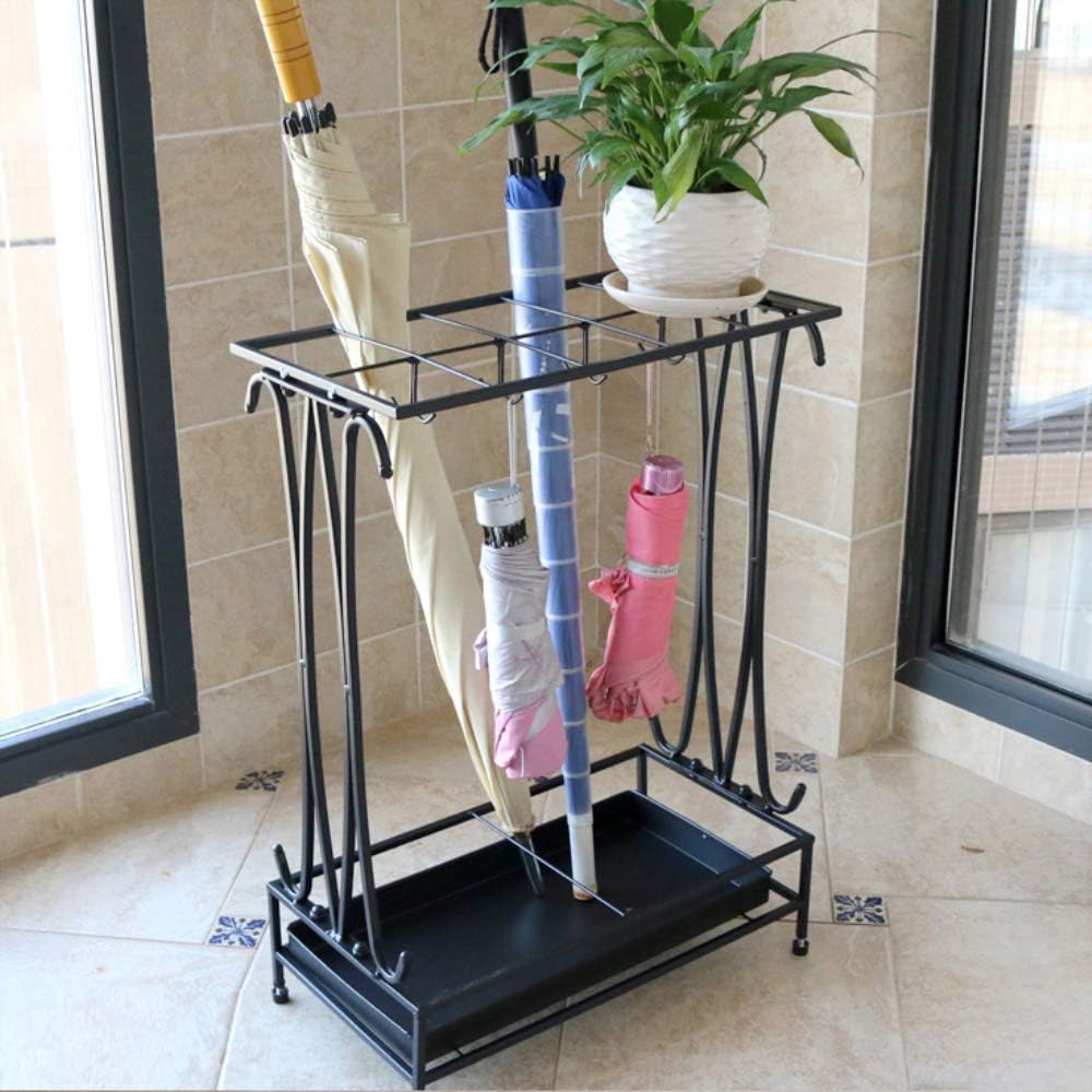 حامل مظلة مع صينية بالتنقيط قابلة للإزالة و 8 خطاف، مظلة معدنية عتيقة حامل حر واقف، رف مظلة صناعي للمنزل والمكتب مدخل الباحة ديكور (أسود)