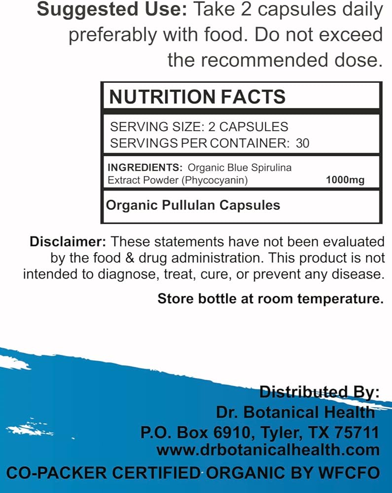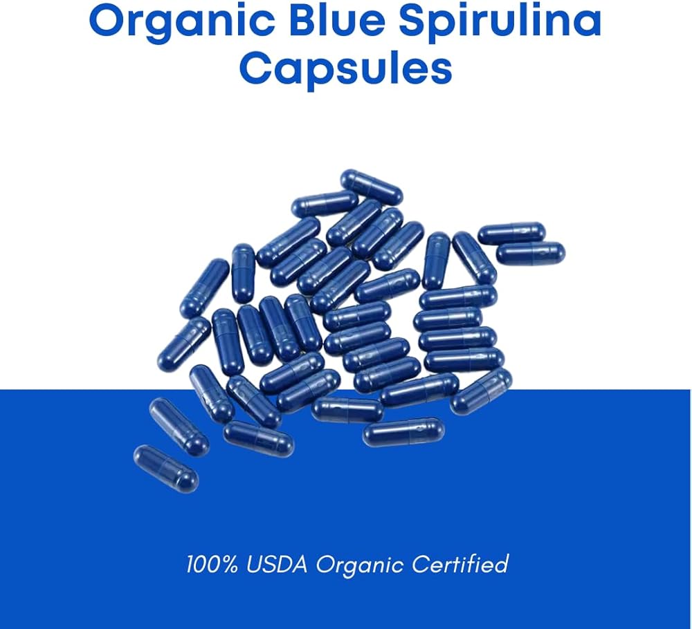 USDA Organic certified capsules contain 30 days' worth of blue spirulina powder, a powerful superfood with a variety of health benefits. Our capsules are vegan friendly, contain no fillers, and provides nutrients. Enjoy the full benefits of blue spirulina in the convenience of our easy to swallow capsules. Suggested Use: Take 2 capsules daily preferably with food. Do not exceed recommended dose. *These statements have not been evaluated by the Food and Drug Administration. This product is not intended to diagnose, treat, cure, or prevent any disease.