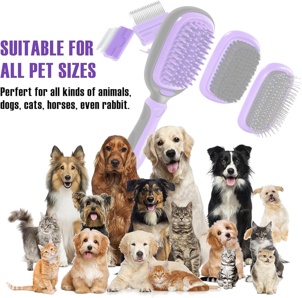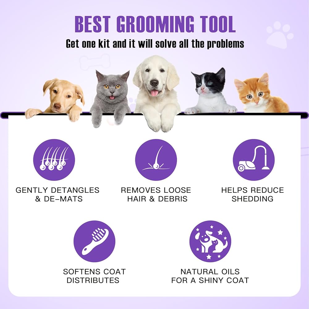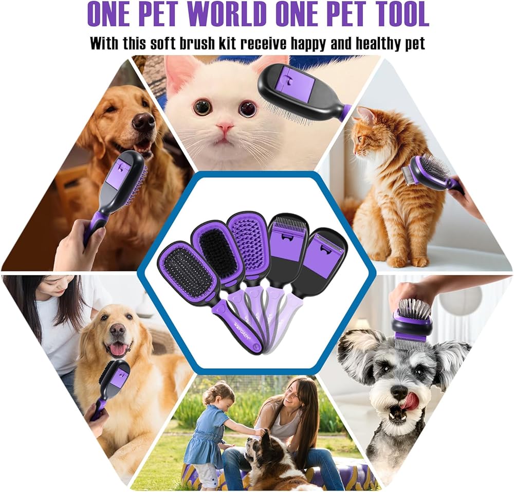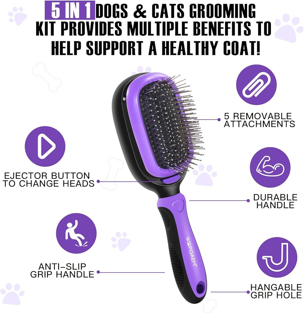 مجموعة العناية بالحيوانات الأليفة 5 في 1 من WOPQAEM للكلاب والقطط ذات الشعر الطويل والقصير. مجموعة فرش للكلاب للسلالات الصغيرة والكبيرة. فك التشابك اللطيف، والتنعيم، والاسترخاء، وإزالة التشابك والتحكم في التساقط. أرجواني