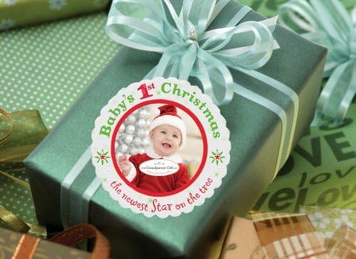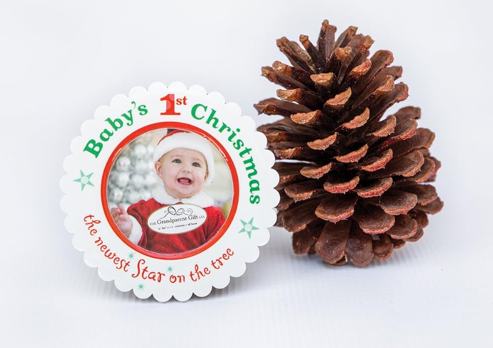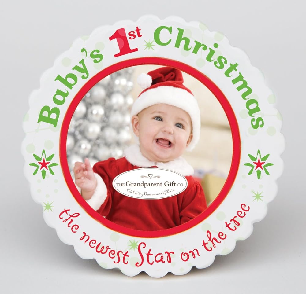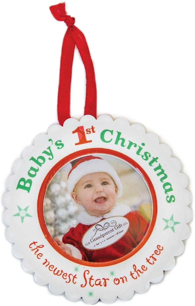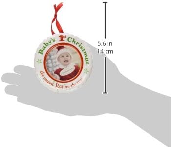 The ornament features a 2" diameter photo space for baby's First Christmas picture.