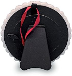 Adorable 3.5" scalloped ceramic photo ornament to celebrate and remember Baby's First Christmas. There is something magical about the First Christmas and a special photograph and ornament will help you relive those memories every year. The ornament features a 2" round space for baby's photograph, and both a red silk ribbon for hanging, and a standing easelback for optional table/shelf display. The ornament is packaged in a clear acetate box.