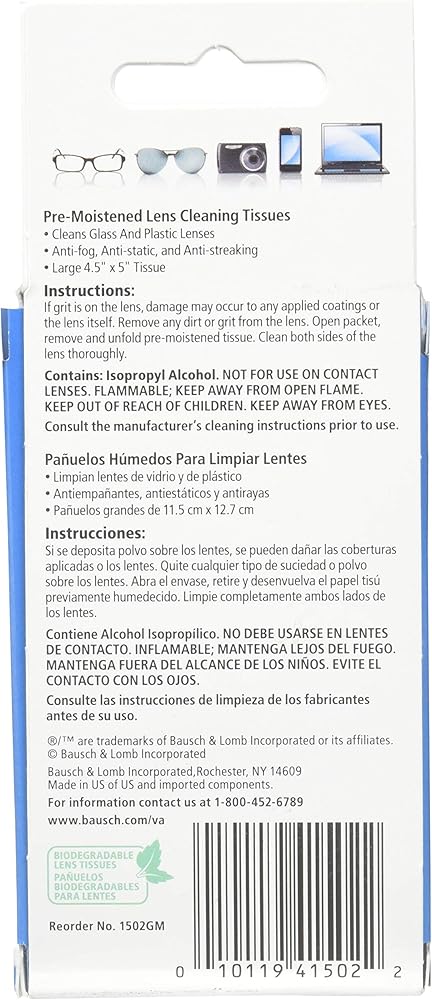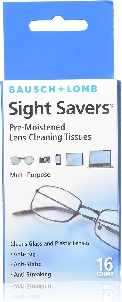 مناديل Bausch & Lomb Sight Savers Pre Moistened (عدد 16) ينظف الزجاج والعدسات البلاستيكية. مضاد للضباب والكهرباء الساكنة ومقاوم للاتساخ. يحتوي على كحول الايسوبريل