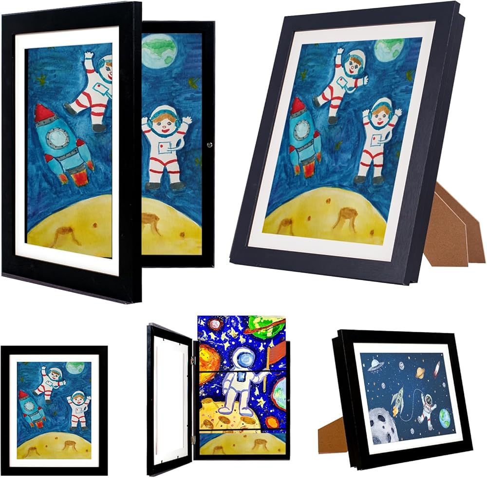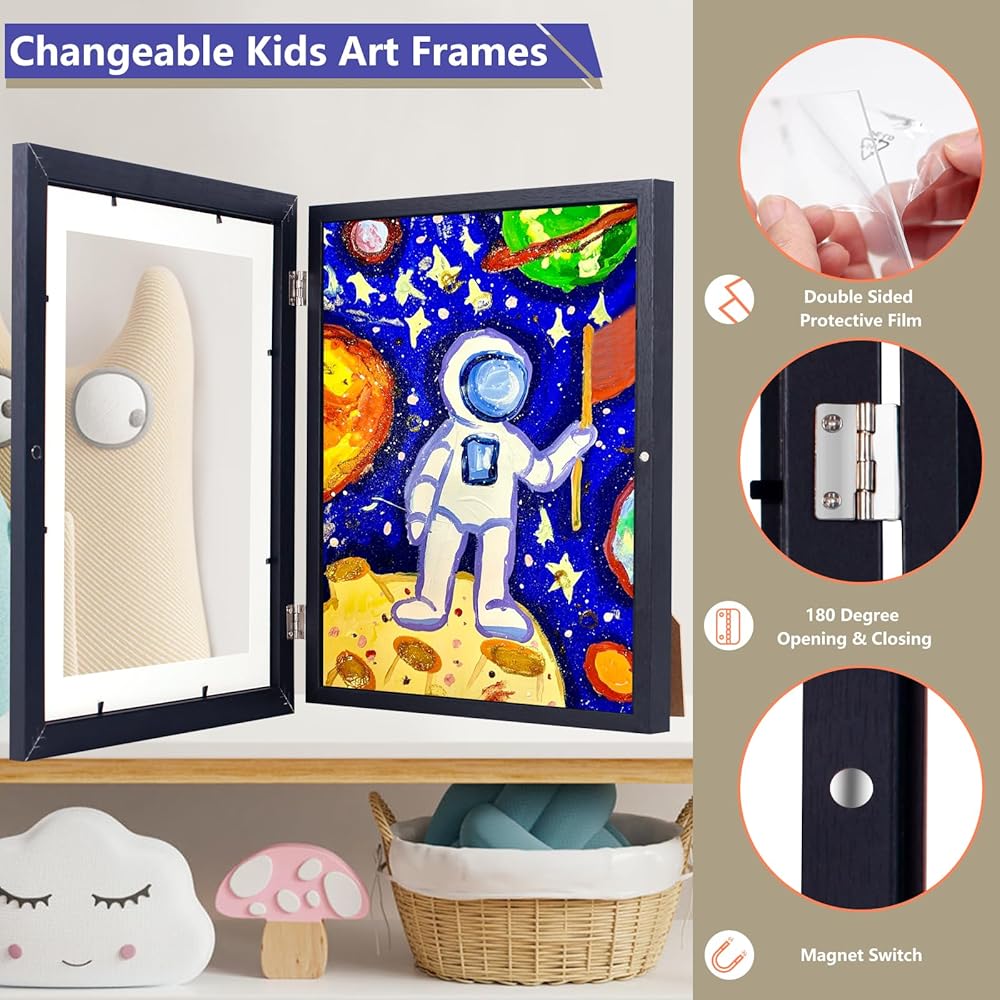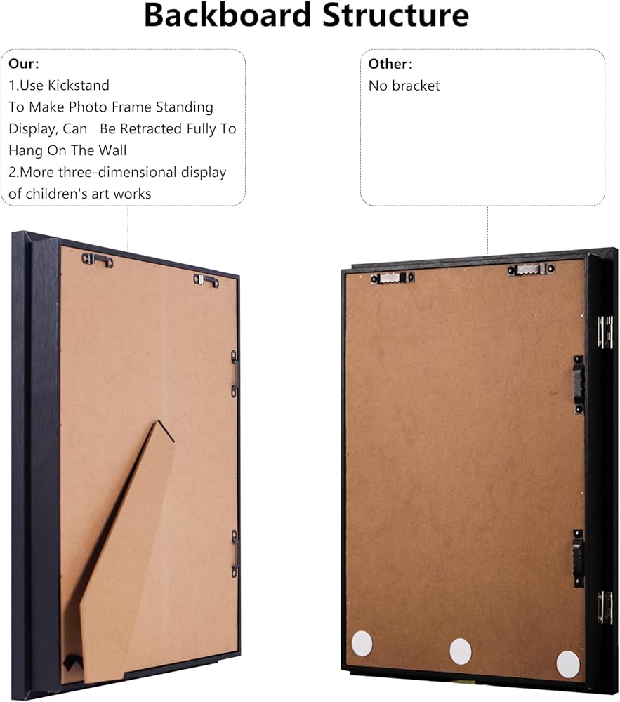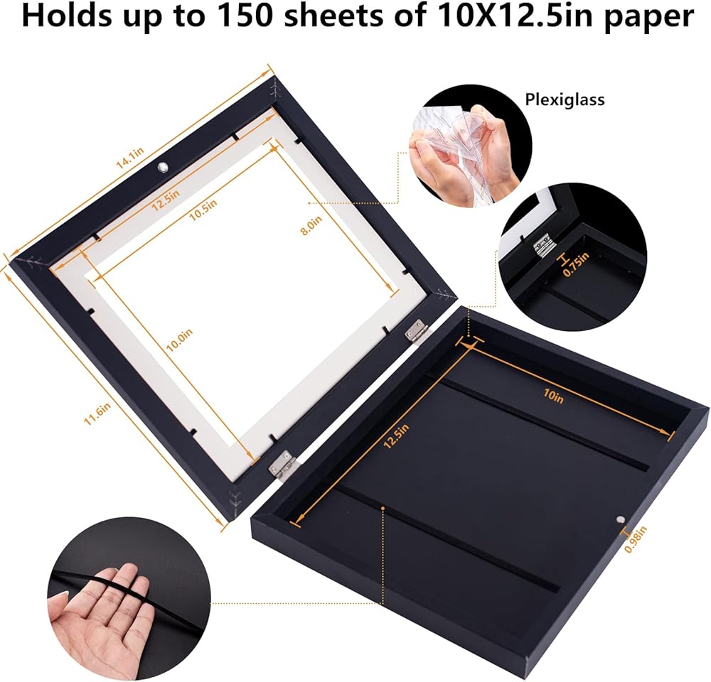 سعة عالية: مناسب تمامًا للأعمال الفنية مقاس 10x12.5 بوصة أو أصغر، حيث يبلغ عمق الإطار 0.6 بوصة، مما يجعله قادرًا على حمل 50-150 قطعة من الأعمال الفنية للأطفال حسب سمك الورق. قم بتخزين وعرض الأعمال الفنية لطفلك في مكان واحد.