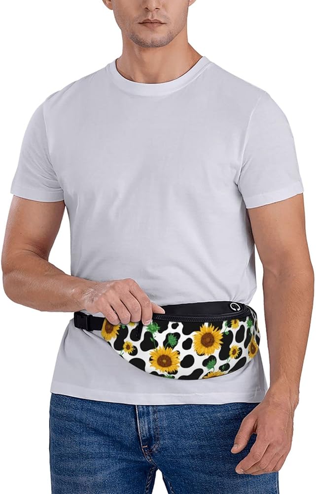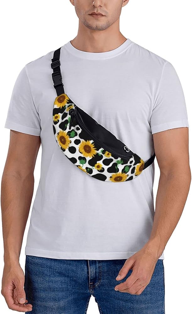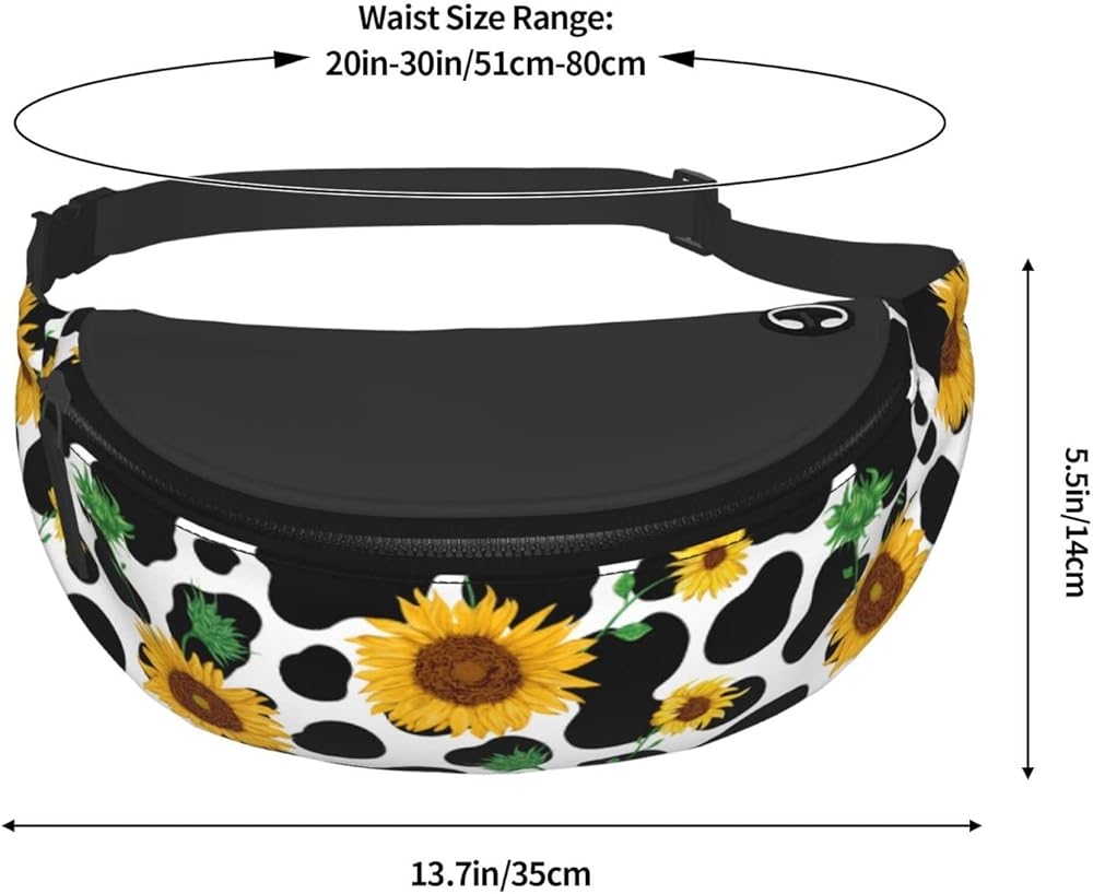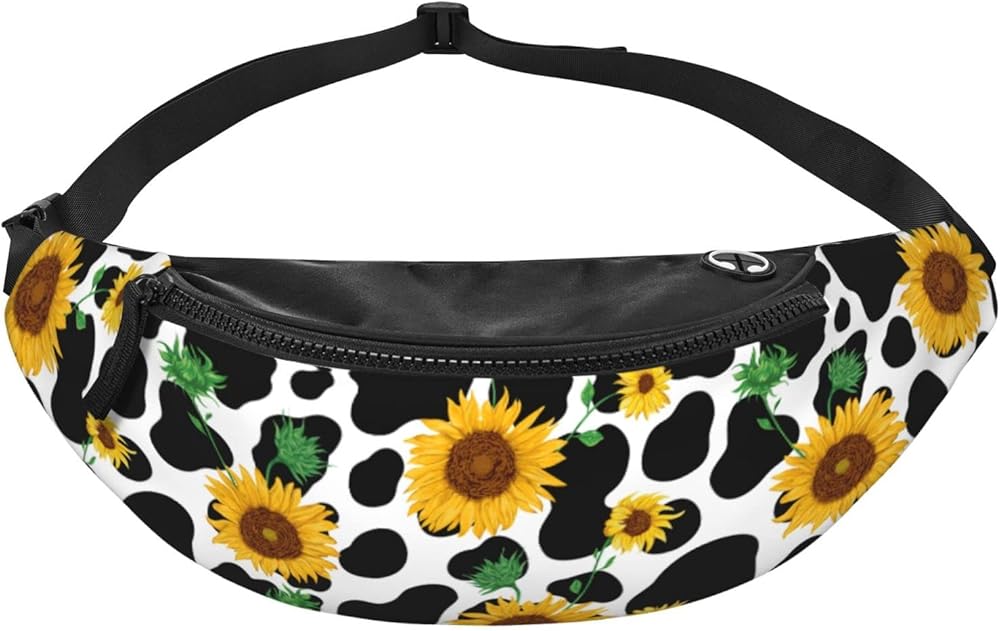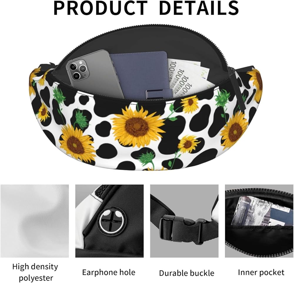 حقائب فاني عباد الشمس مطبوعة بقرة للنساء مع فتحة لسماعة الأذن، حقيبة حزام قابلة للتعديل للنساء، حقيبة خصر عبر الجسم حقيبة صدر للنساء للتنزه سيرًا على الأقدام والسفر والجري