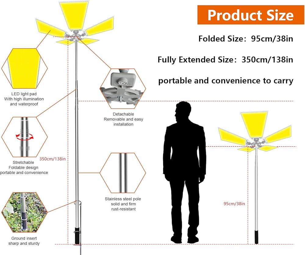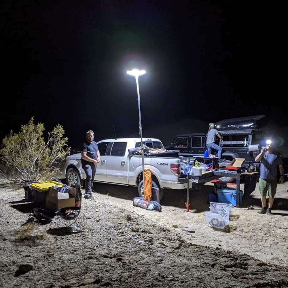 【Wide Use+Excellent Energ】: Telescoping Camping lights stand to 138 '' high, can connect camping telescoping led to the car battery,or use with any 12V power adapter. Widely used in garage, Backyard light,travel , Outdoor Camping, telescopic fishing night, etc.