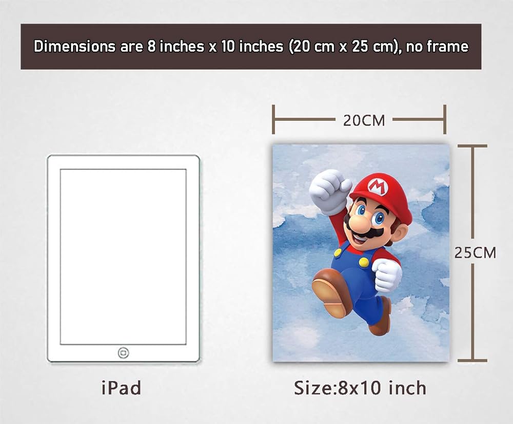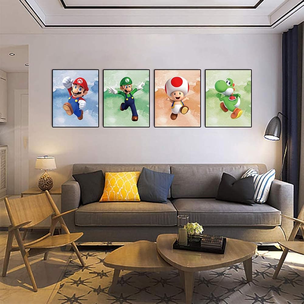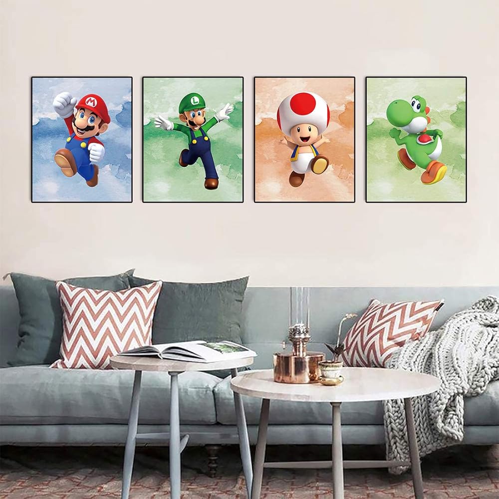 مجموعة لوحات فنية مطبوعة من سوبر ماريو لتزيين غرفة الالعاب واعياد الميلاد مكونة من 4 قطع (صورة قماشية 8 انش × 10 انش)، بدون اطار