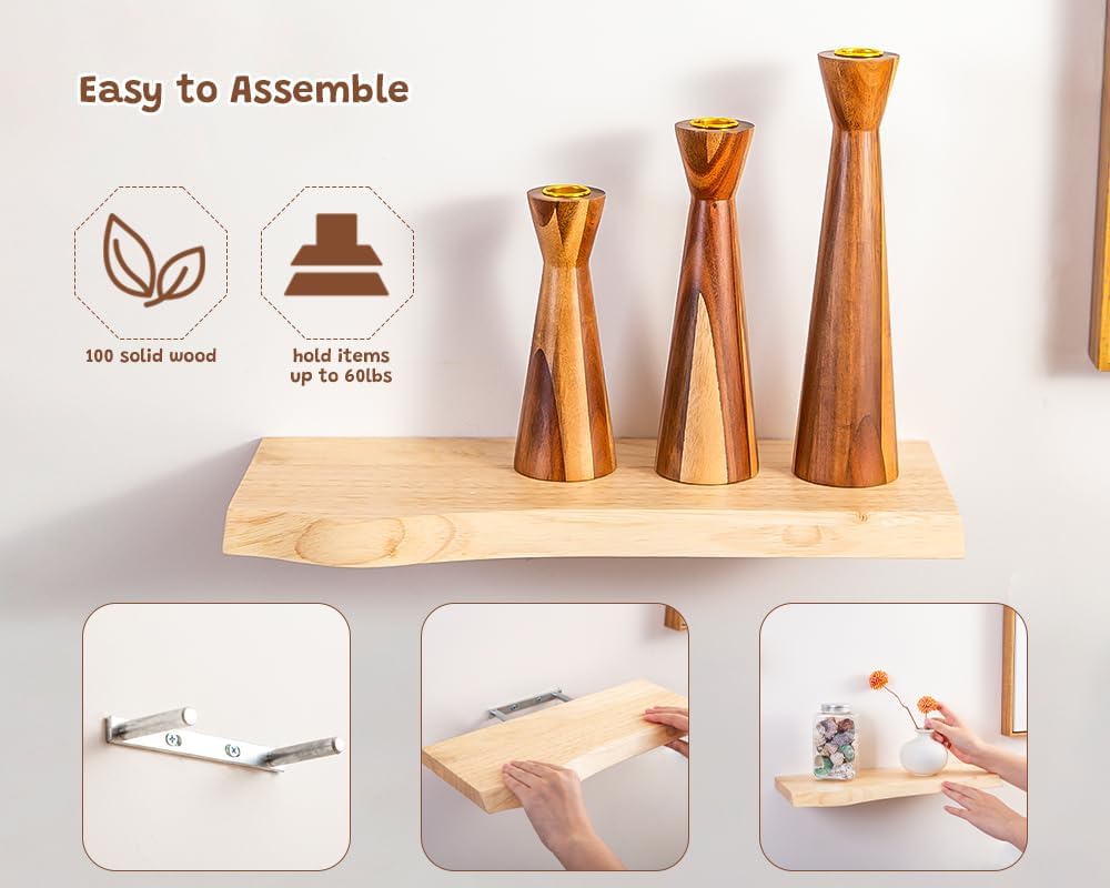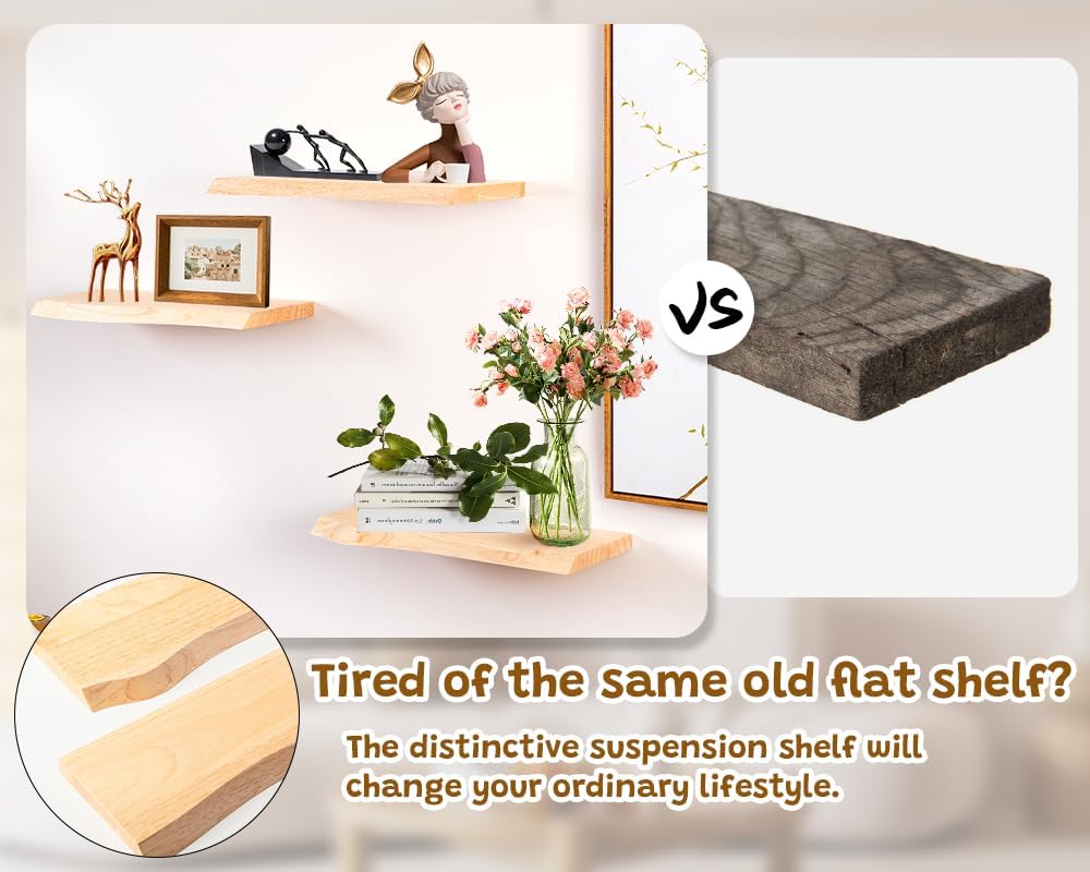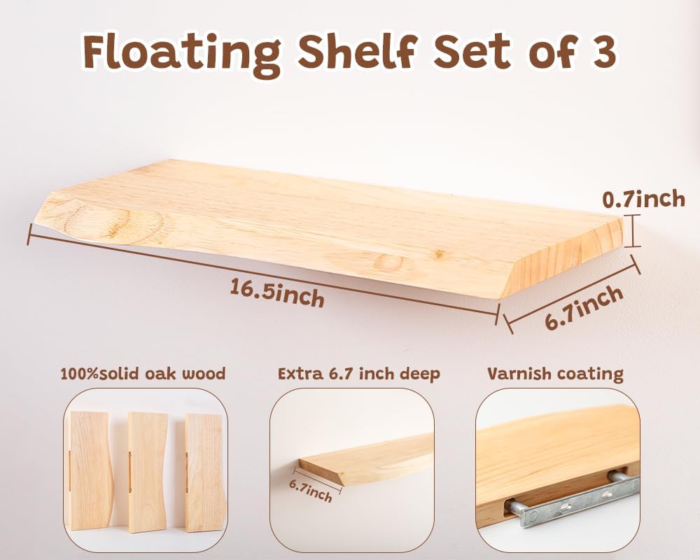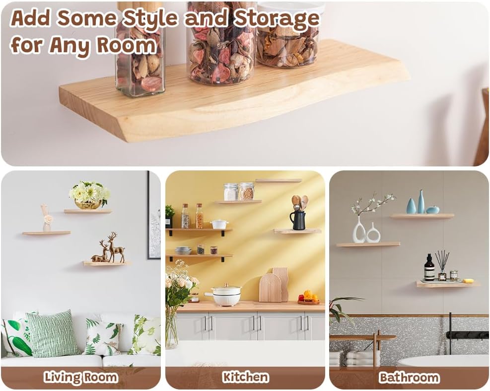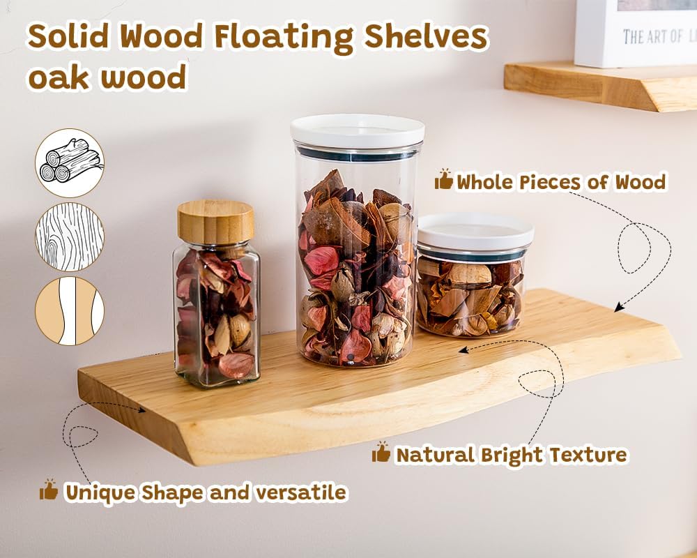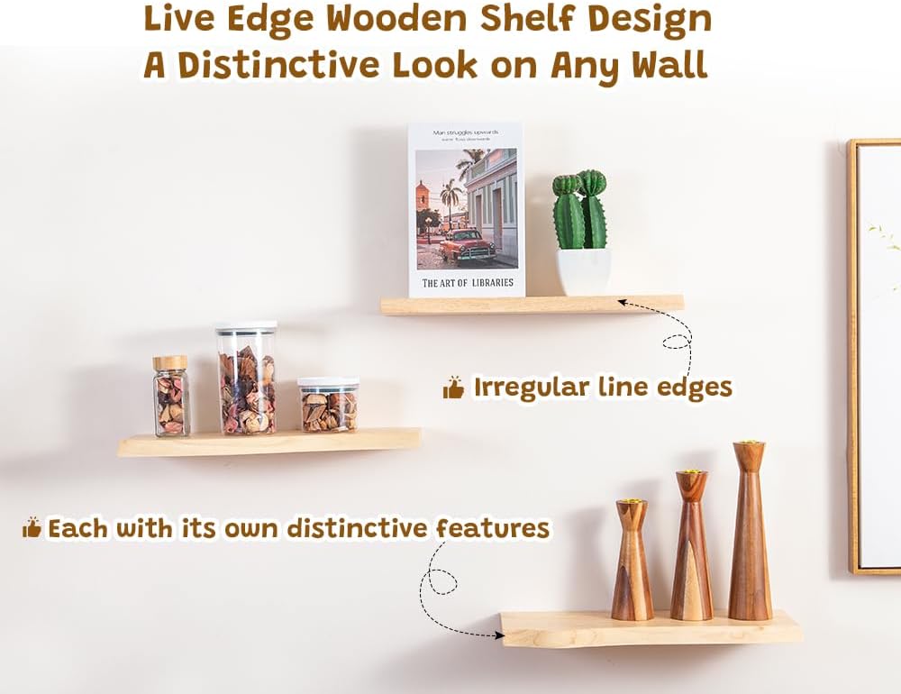 Wall Mounted Floating Shelves with Live Edge Design, Irregular Rectangle Wall Decoration Shelf Set of 3, Solid Oak Wood Wall Display Organizer, Home Wall Storage Decor Shelve