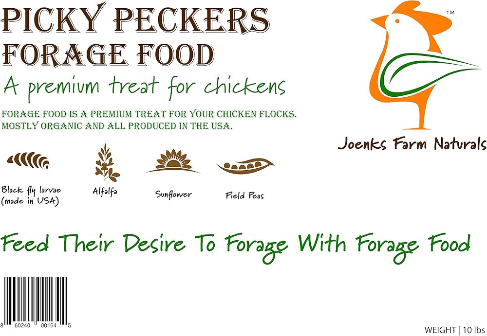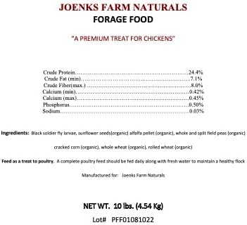 Forage Food (10lbs) is a Premium Treat For Chickens, Featuring USA Grown Black Soldier Fly Larvae (grubs) which are High in Calcium & Protein. Forage Food ingredients are all produced in the USA. Forage Food also contains carefully selected organic ingredients like alfalfa, sunflowers, corn, and field peas. Forage Food is meant to supplement your flocks balanced feed in addition to their normal foraging activity. When your chickens dig, scratch & peck, they are Foraging – they are looking for goodies. Forage Food helps fulfil this natural instinct to forage. Feeding directions: Forage Food is intended to be an occasional snack for your flocks. Scatter a few handfuls directly onto the ground to encourage more natural foraging and scratching behavior. Forage Food ingredients change based on ingredient availability and for the sake of variety. Check feed label for most updated ingredients list. Always have a clean, fresh water source and grit readily available. Wash hands after use and consult your veterinarian for any changes to your flock's diets. Store in a cool dry place and keep bag zipped up tightly when not in use.