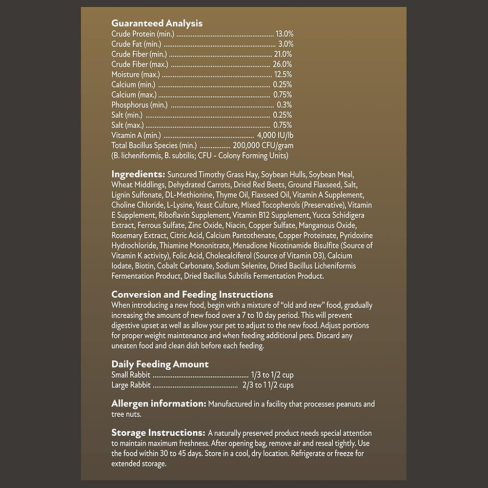 Kaytee Field+Forest is a premium rabbit food made with wholesome ingredients your pet can smell and taste. Each ingredient is carefully curated from nature's fields and forests to support your rabbit's diet. The all-in-one pellet works to ensure naturally good nutrition in every bite with unique shapes and ridges that support dental health by encouraging your pet's natural chewing instinct. Kaytee Field+Forest is simply good food. It contains NO added molasses, NO fillers, and NO artificial preservatives.