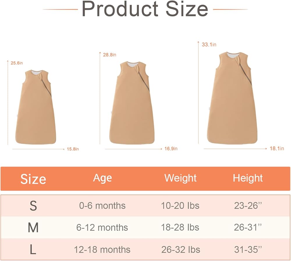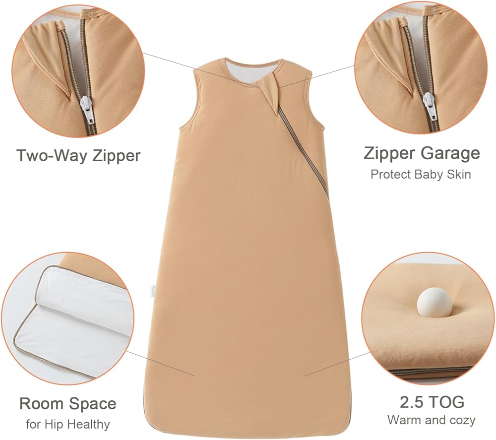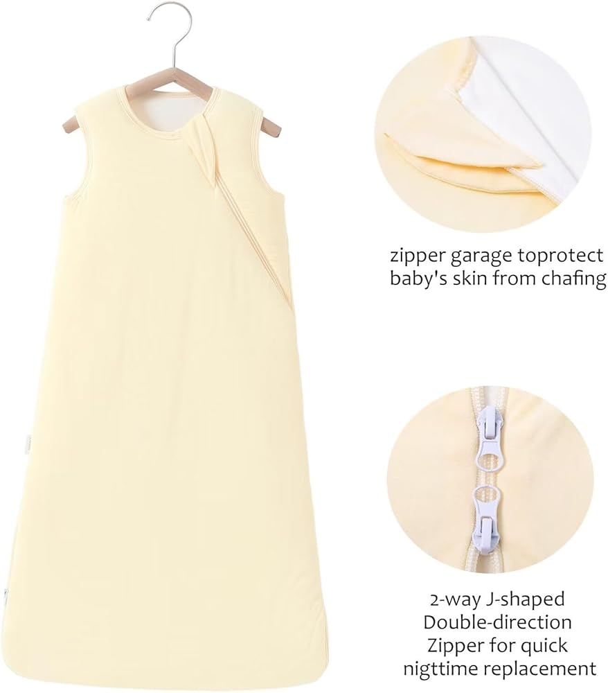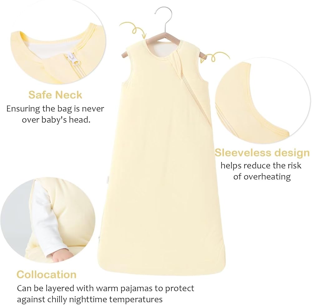 Ingenious Design: TOG rating 2.5,suitable for 61-68°F(16-20°C). The sleeveless design of the sleep sack helps with heat loss and air circulation, reducing the risk of overheating, and can be layered with warm pajamas to protect against cold temperatures.