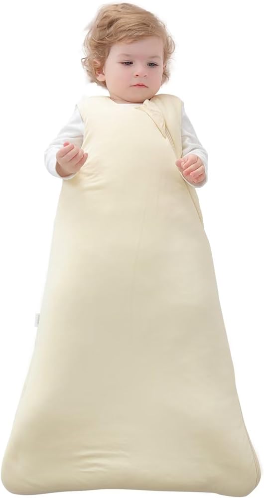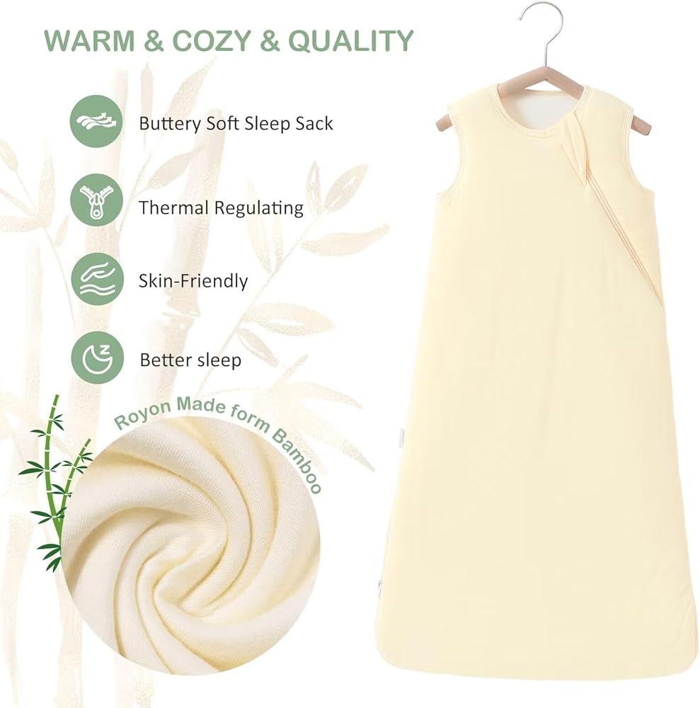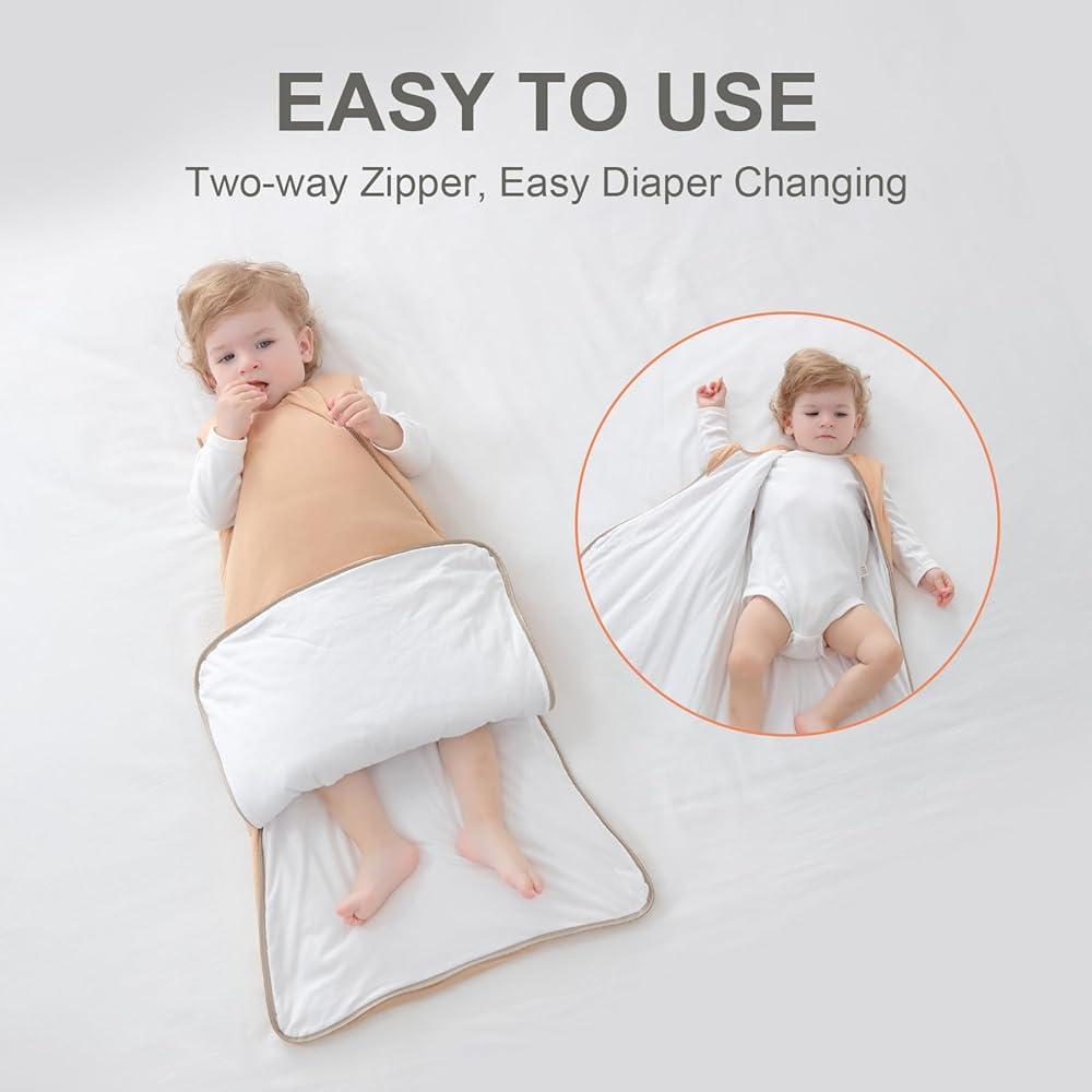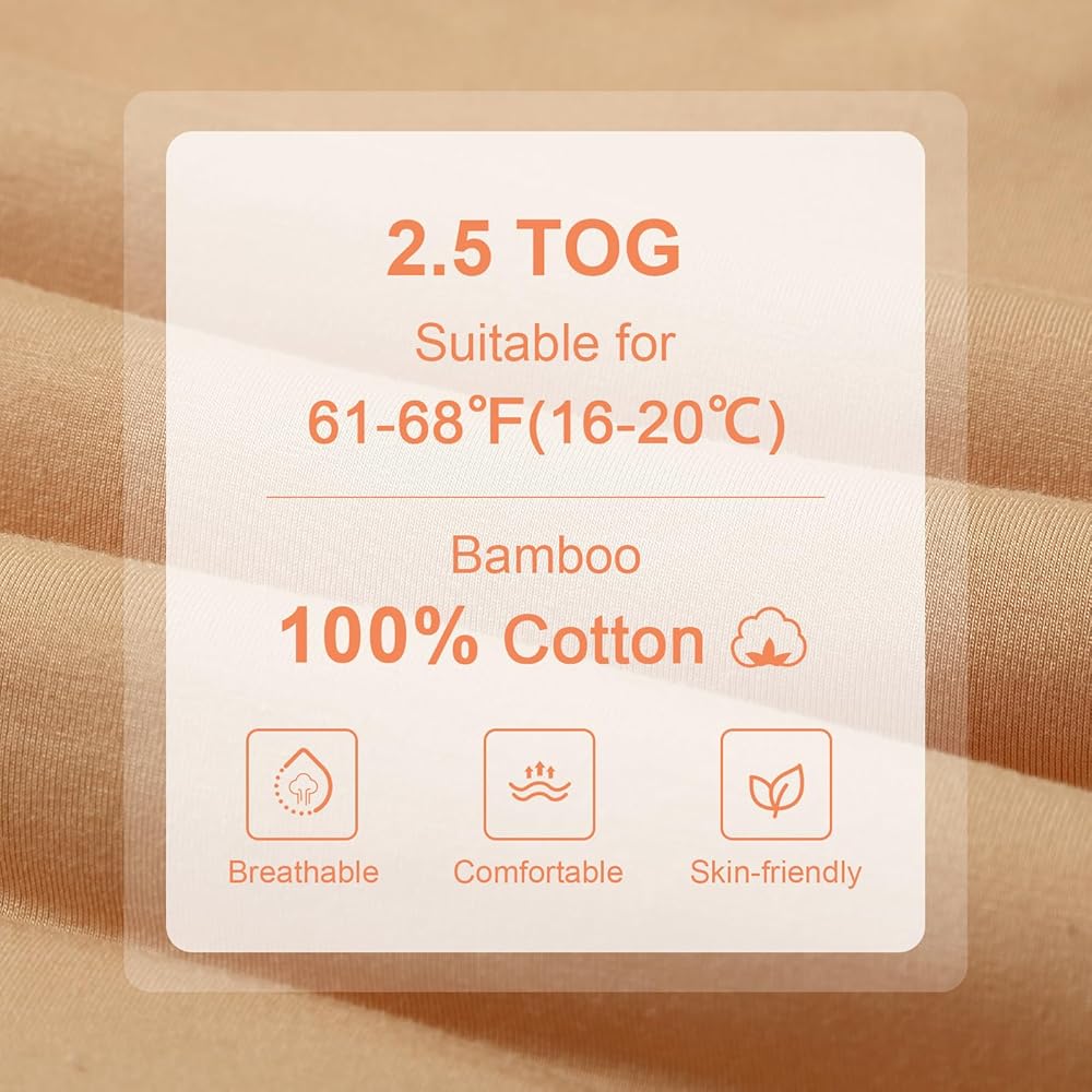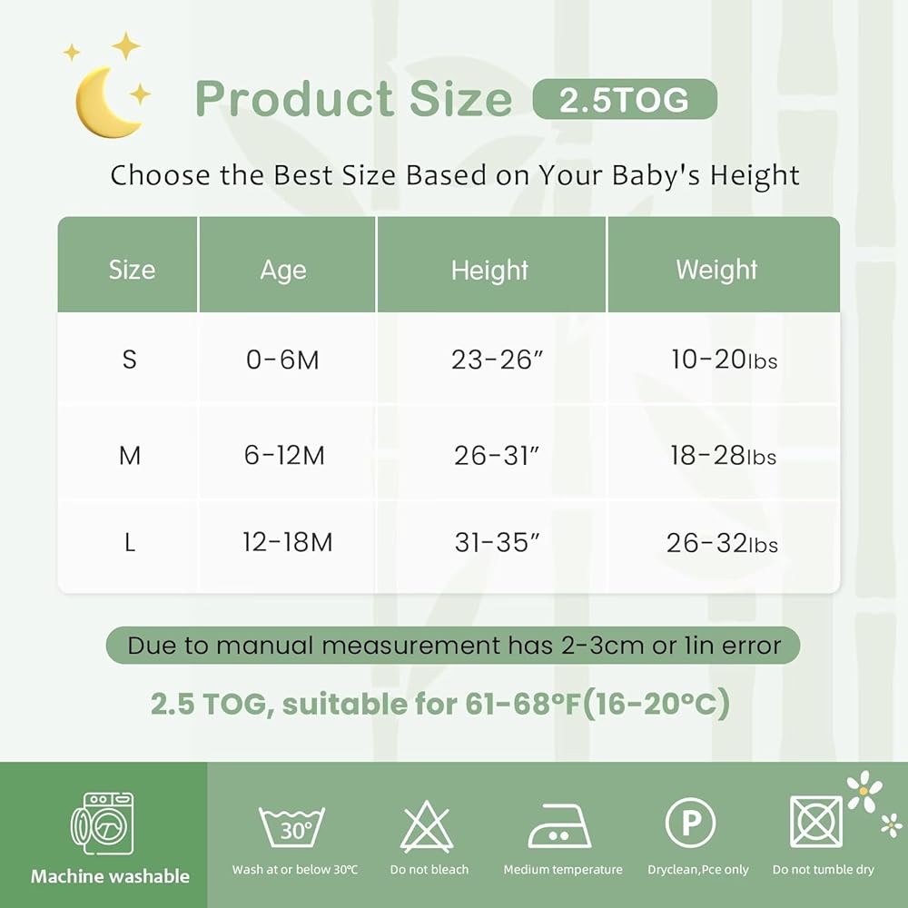 Ingenious Design: TOG rating 2.5,suitable for 61-68°F(16-20°C). The sleeveless design of the sleep sack helps with heat loss and air circulation, reducing the risk of overheating, and can be layered with warm pajamas to protect against cold temperatures.