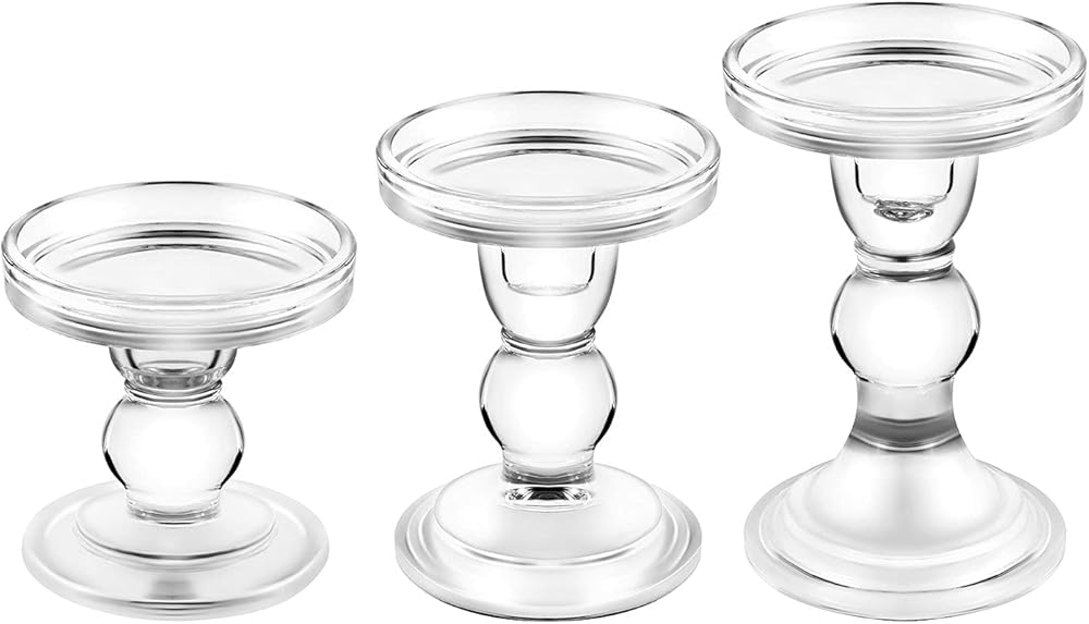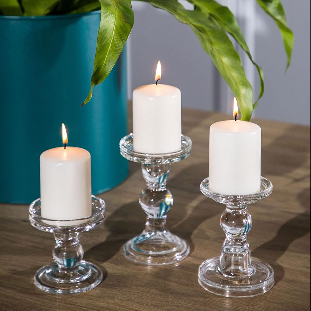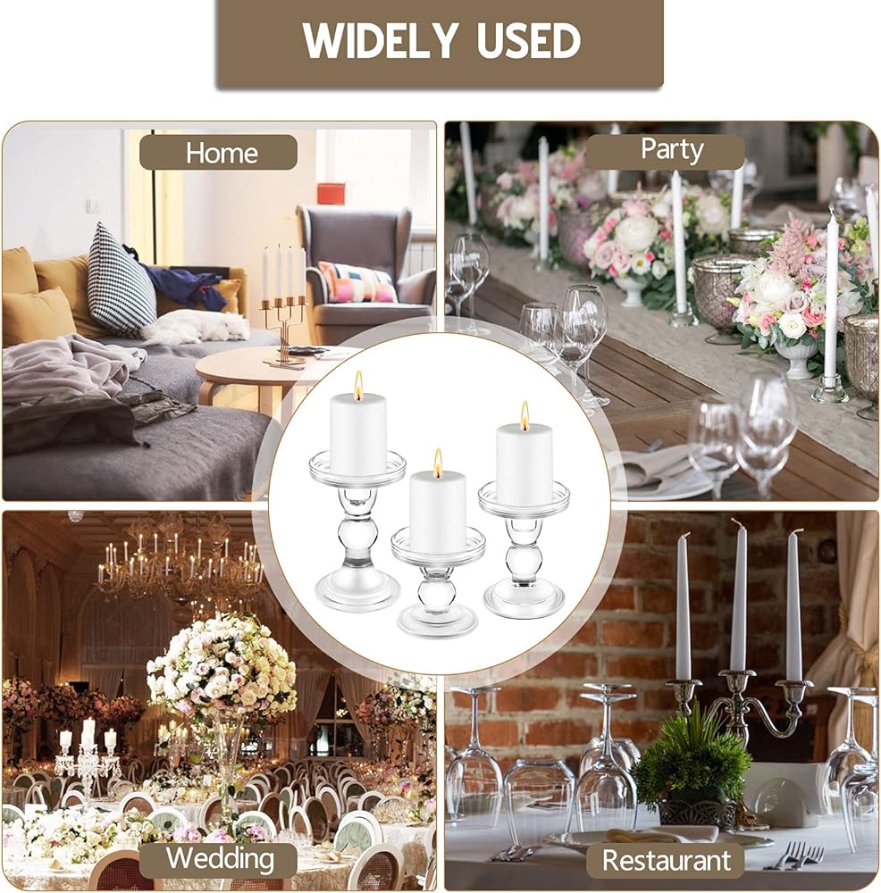 💎【ELEGANT DESIGN】The glass candle holder set includes 3 holders in different size; Made of high-quality glass with high transparency, clear and elegant design, perfect for pillar candle and tea light candle