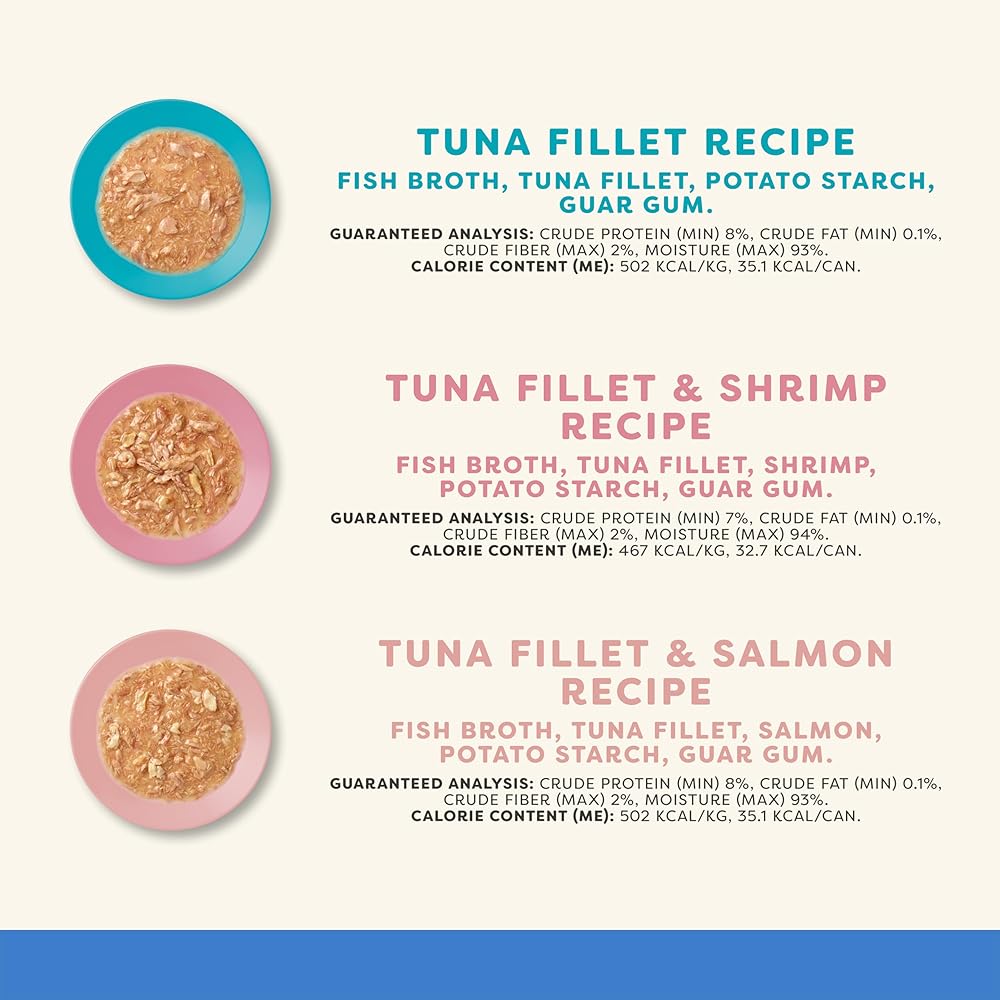 • Each pack includes 4 x 5.5oz Chicken, 4 x 5.5oz Chicken & Cheese, and 4 x 5.5oz Chicken & Duck in Broth. A total of 12 cans.