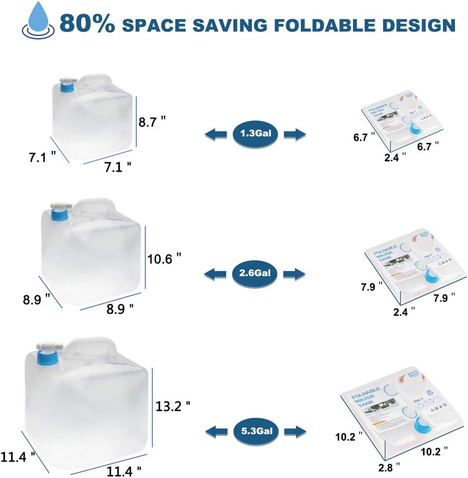 80% SPACE SAVING: Space saving design makes the folding water tanks easy to store away. Lightweight and soft materials make holding and transport easy. Just put the collapsible water cube in your cabinets, backpacks or in your cars.Perfect for outdoor activities like camping, RV, hunting, hiking, backpacking, fishing, picnics, BBQs, sports, festivals, parties and beach.