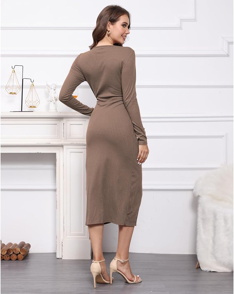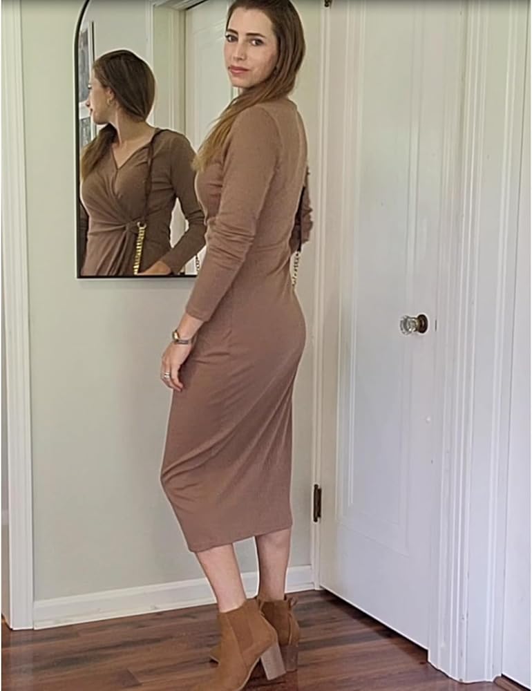 • التصميم - فستان متوسط ​​الطول بأكمام طويلة يتميز برقبة على شكل حرف V، وواجهة ملتوية، وحاشية غير منتظمة، وفتحة جانبية، ومقاس نحيف يمكن أن يحتضن جسمك في جميع الأماكن الصحيحة. يُعد هذا الفستان الشتوي الملتف قطعة أساسية في خزانة الملابس ويجسد الراحة والأسلوب الكلاسيكي العتيق.