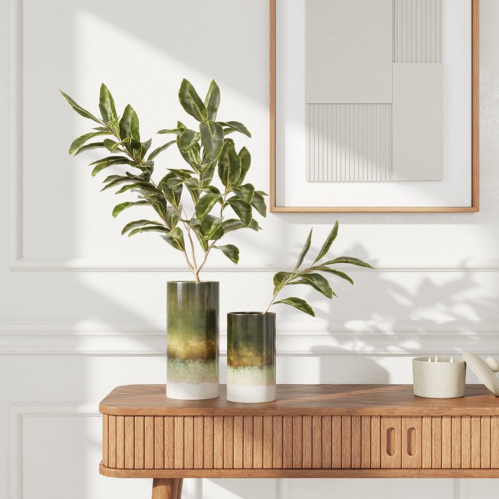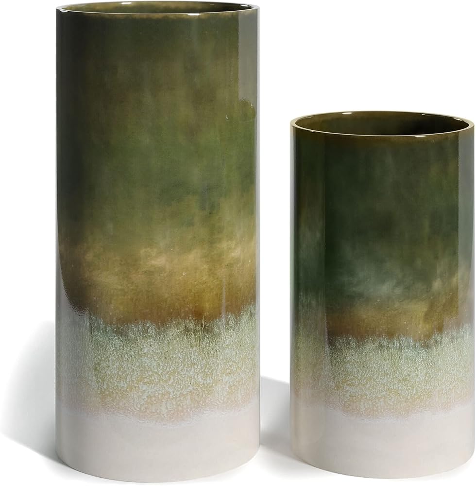 المزهريات الأسطوانية السيراميكية S/2 من مودرن ماركت: ستضيف هذه المجموعة المكونة من 2 مزهرية عصرية لديكور المنزل جاذبية ريفية إلى مجموعة منزلك. مع لوحة جديدة ترابية، سيضيف هذا الديكور المنزلي المحايد للأرفف طرازًا مستوحى من الفنانين إلى ديكور منزلك الريفي. الألوان مُلطفة بصريا، مما يجعل المزهرية الطويلة الخاصة بنا إضافة مثالية لتزيين منزلك وديكور مزرعة المنزل. هذه المزهريات السيراميكية المخصصة للديكور المنزلي مثالية للعرض بمفرده أو مملوءة بالزهور الصناعية أو الحقيقية. مزهريات الفخار لديكور المنزل مصنوعة يدويًا. استخدم مجموعة المزهرية الخزفية كمزهرية زهور في المزرعة أو املأها بالسيقان المجففة وأوراق الشجر. كما يبدو ديكور مزهرية بوهو مذهلاً عند عرضها لوحدها كزينة لافتة للنظر. مزهريات ديكور المنزل الخاصة بنا مخصصة للاستخدام في الأماكن المغلقة، مما يجعلها ديكور ريفي رائع للمنزل. اعرض مجموعة مزهرية السيراميك على طاولة لوحة التحكم أو استمتع بديكور منزلي ريفي لغرفة المعيشة. مزهريات مثالية لديكور المنزل الحديث أو ديكور الرف الريفي. تظهر صورة ظلية على شكل برعم بلمسة نهائية من الحجرية، هذه المزهريات الريفية للديكور تثير مظهر ديكور منزلي حديث النمط متعدد الاستخدامات لهذه المزهريات للديكور مثالي لأي شخص يبحث عن ديكور منزلي راقي للرفوف أو بديل للمزهريات الخضراء للديكور. استخدم هذه المزهريات المزخرفة كمزهريات أرضية أو كديكور للمنضدة المركزية. هذه المزهريات الصغيرة للديكور ستجعل اللمسات المثالية لتزيين رف المطبخ، ديكور رف غرفة المعيشة، ديكور طاولة المدخل، أو ديكور رف المزرعة. ميزات المنتج: اللون: أخضر أومبر. للاستخدام في الأماكن الداخلية فقط. مصنوعة يدوياً. تعليمات العناية: غسيل يدوي فقط. المواد: خزف حجري. المقاس: L: 4. 5" x 4. 5" x 9. 5 بوصة" S: 10.16 سم × 10.16 سم × 17.78 سم. الحجم: L: 1. 75, S: 1 لتر. عرض الفتحات: L: 12 سم، S: 10 سم. قطر القاعدة: L: 11.43 سم، S: 10.16 سم. الوزن: 1.6 كجم.