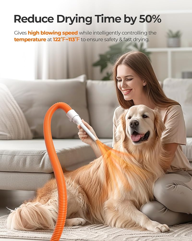 🔆🌡️【Comfortable and Safe Drying Experience】Our grooming kit features an smart thermostat system that maintains a temperature range of 122℉ to 113℉. The optimal temperature helps prevent overheating while effectively drying your pet and ensures a fast & safe drying process. With adjustable 3 blowing speeds, you can customize the airflow to suit your pet's comfort level. Say goodbye to wet and uncomfortable pets after bathing!