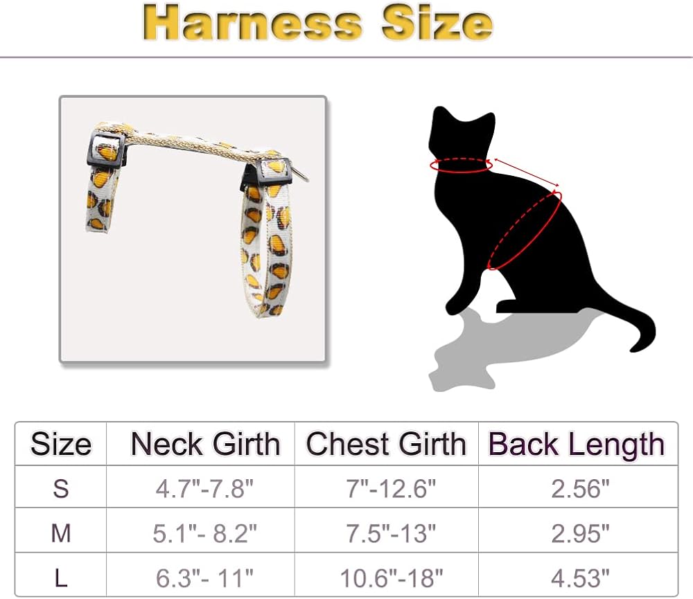 Size Large: Neck girth 6.3”-11.0”, chest girth 10.6”-18”, back length 4.53", width 3/8”, leash length 59”, please measure your cat's neck and chest girth before purchase.