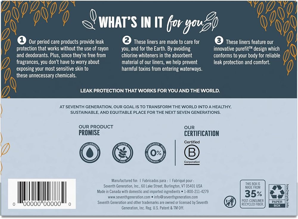 Seventh Generation Chlorine Free Panty Liners Light for daily use, light flow, or as tampon backup, their pantiliners are convenient, discreet, practical, and chlorine-free. Features secure, no-slip adhesive and a soft, cloth-like cover for comfort. Their pantiliners are made of a combination of absorbent materials, polyolefins, adhesives, and a silicone coated paper. The top layer is a non-woven polyolefin cover sheet. The absorbent material consists of chlorine free wood pulp. Not whitened with chlorine Safer for sensitive skin - no dyes or fragrances Soft, cloth-like cover for comfort Reliable protection for lighter flow days Secure, no-slip adhesive Restore The EnvironmentRestore is the next reduce, reuse, recycle.