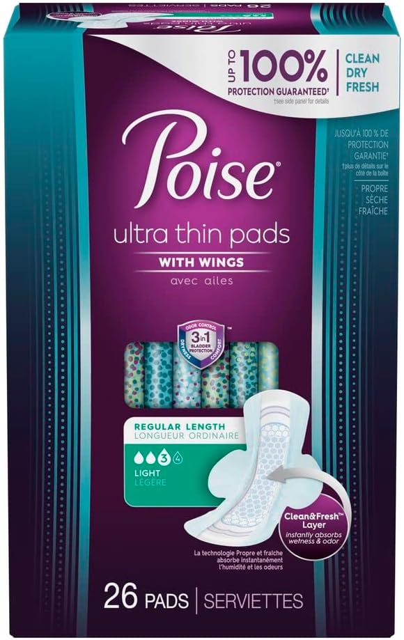 Poise, فوط سلس البول الرفيعة للغاية مع وسادات التحكم في المثانة ذات الامتصاص الخفيف بالأجنحة، 26 قطعة