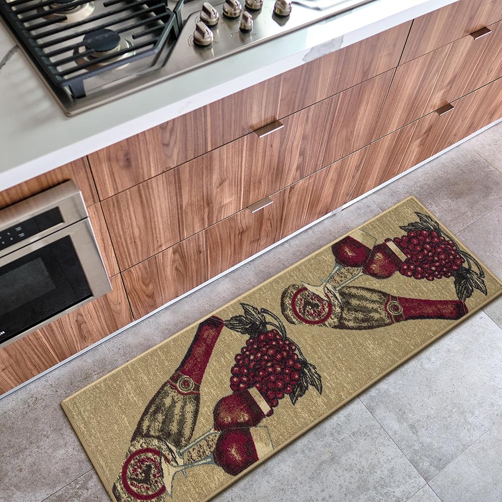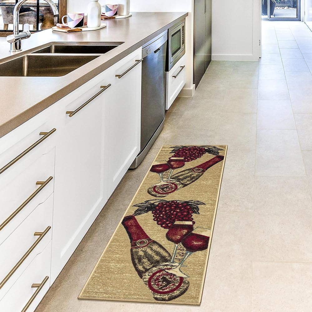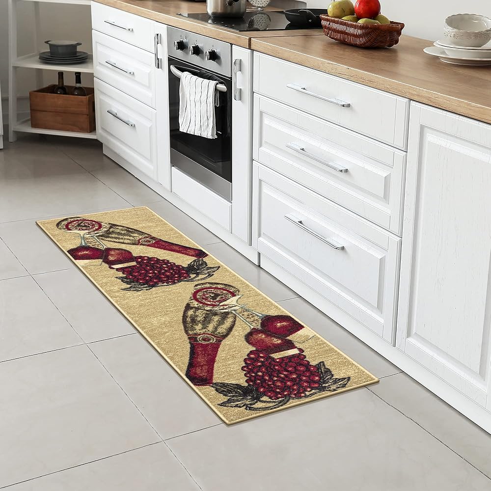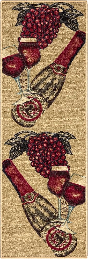 [TRENDY STYLE]: This Colorful Wine Design Rug features a unique print of grapes, wine bottles and glasses in shades of red and black on a beige background while also adding color and enhancing the look of your home. Its timeless design can be integrated into a variety of home décor styles.