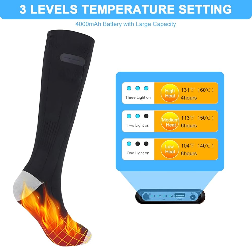 جوارب حرارية للرجال والنساء، جوارب حرارية ببطارية كهربائية قابلة لإعادة الشحن بقدرة 4000 مللي أمبير في الساعة، جهاز تدفئة القدمين قابل للغسل في الشتاء مع 3 إعدادات للحرارة للتخييم والتزلج والمشي لمسافات طويلة والصيد والرياضات الشتوية الخارجية والداخلية