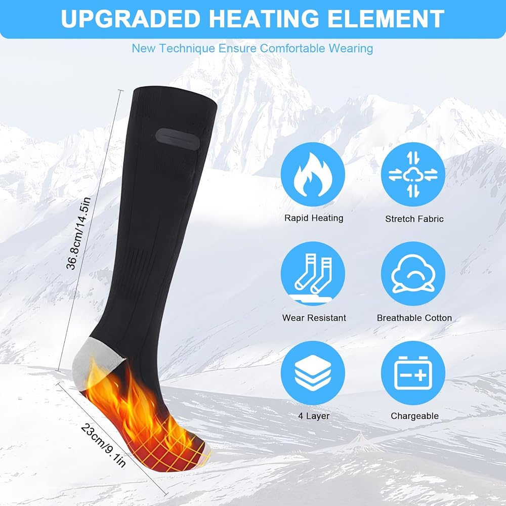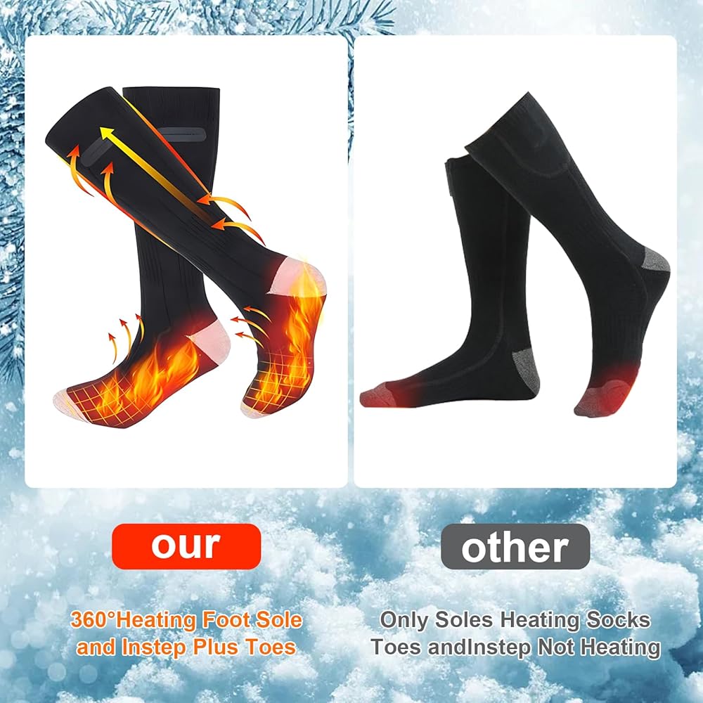 • 【360° All-Round Heating】Our updated electric socks replace the traditional heating wire with a heating sheet, which has a larger heating area, which is scattered in the fabric and covers the whole toe area, 360° all-round heating area(instep and toe). The heating is even, won't burn your feet and promote blood circulation. It is helpful for outdoor sports enthusiasts, people who are afraid of cold, arthritis or Raynaud's syndrome.