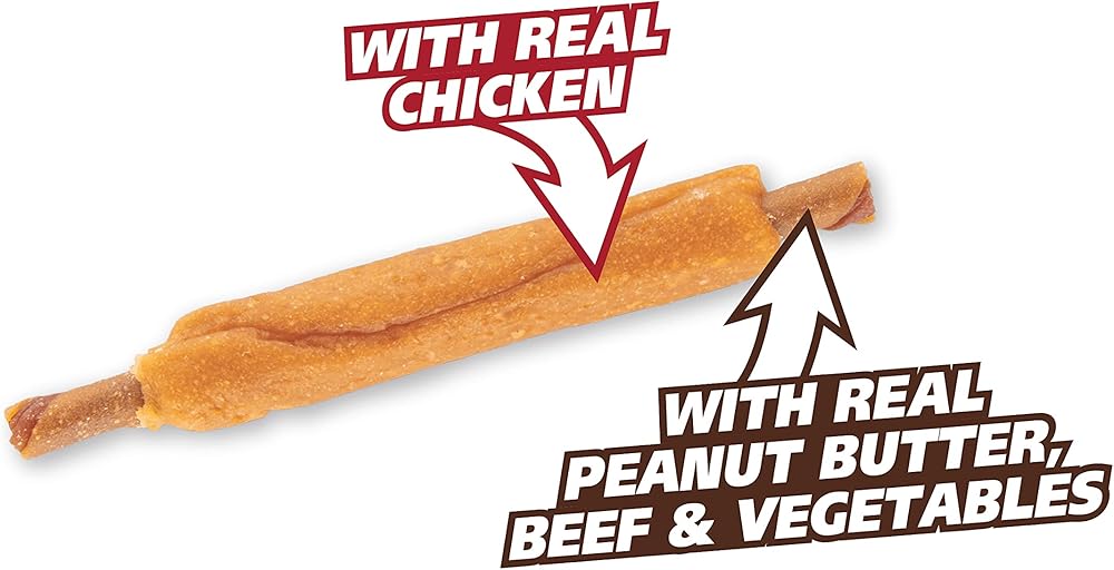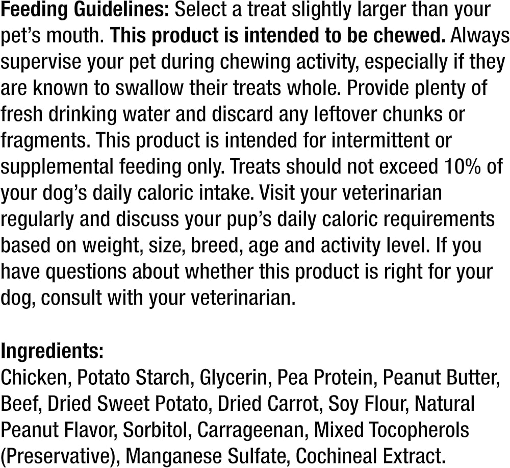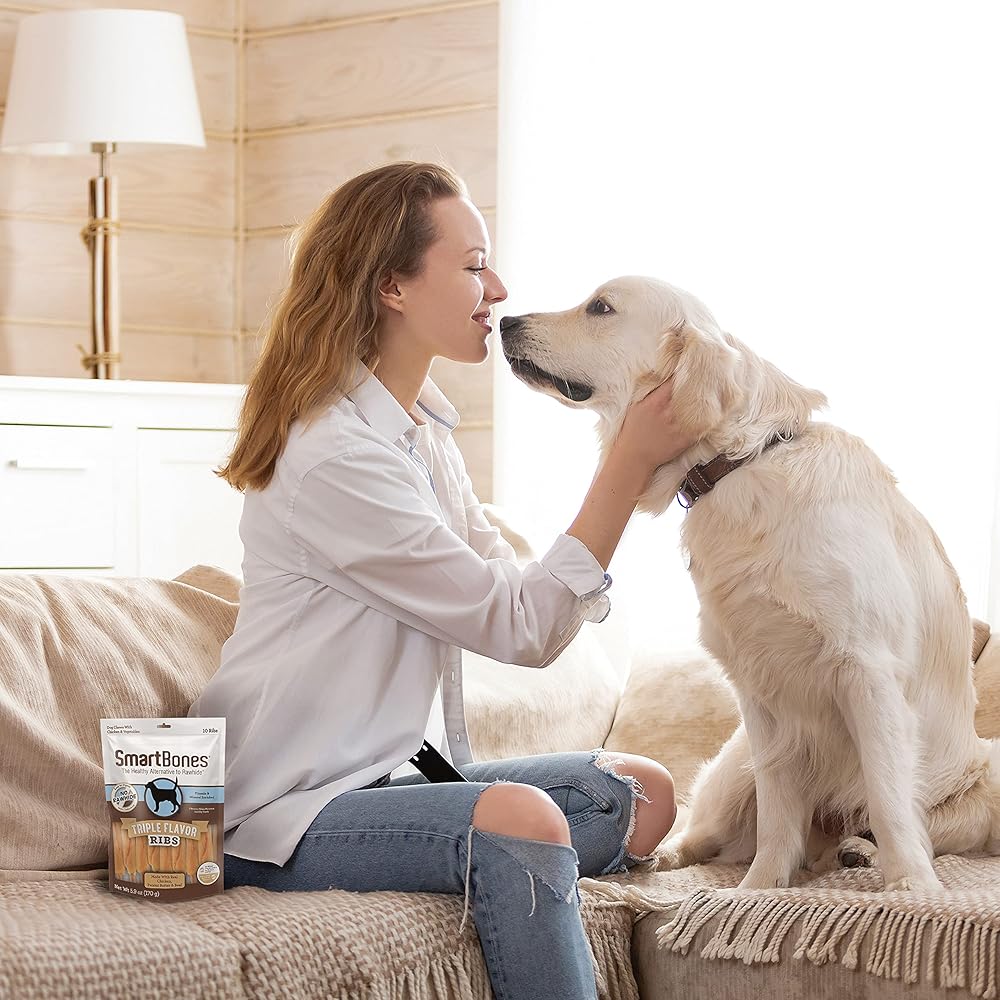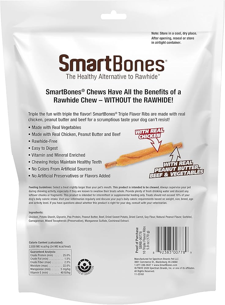 SmartBones® chews have all the benefits of a rawhide chew….without the rawhide! No-rawhide SmartBones chews are made with real chicken and wholesome vegetables for a scrumptious taste dogs can't resist! Triple the fun with triple the flavor! SmartBones® Triple Flavor Ribs are made with real chicken, peanut butter and beef for a scrumptious taste your dog can't resist! Plus, these rawhide-free chews are easy to digest and vitamin and mineral enriched. Made with no colors from artificial sources and no artificial preservatives or flavors added, you can feel good about giving these delicious chews to your pup. Select a treat slightly larger than your pet's mouth. This product is intended to be chewed. Always supervise your pet during chewing activity, especially if they are known to swallow their treats whole. Provide plenty of fresh water and discard any leftover chunks or fragments. This product is intended for intermittent or supplemental feeding only. Treats should not exceed 10% of your dog's daily caloric intake. Visit your veterinarian regularly and discuss your pup's daily caloric requirements based on weight, size, breed, age and activity level. If you have questions about whether this product is right for your dog, consult with your veterinarian.