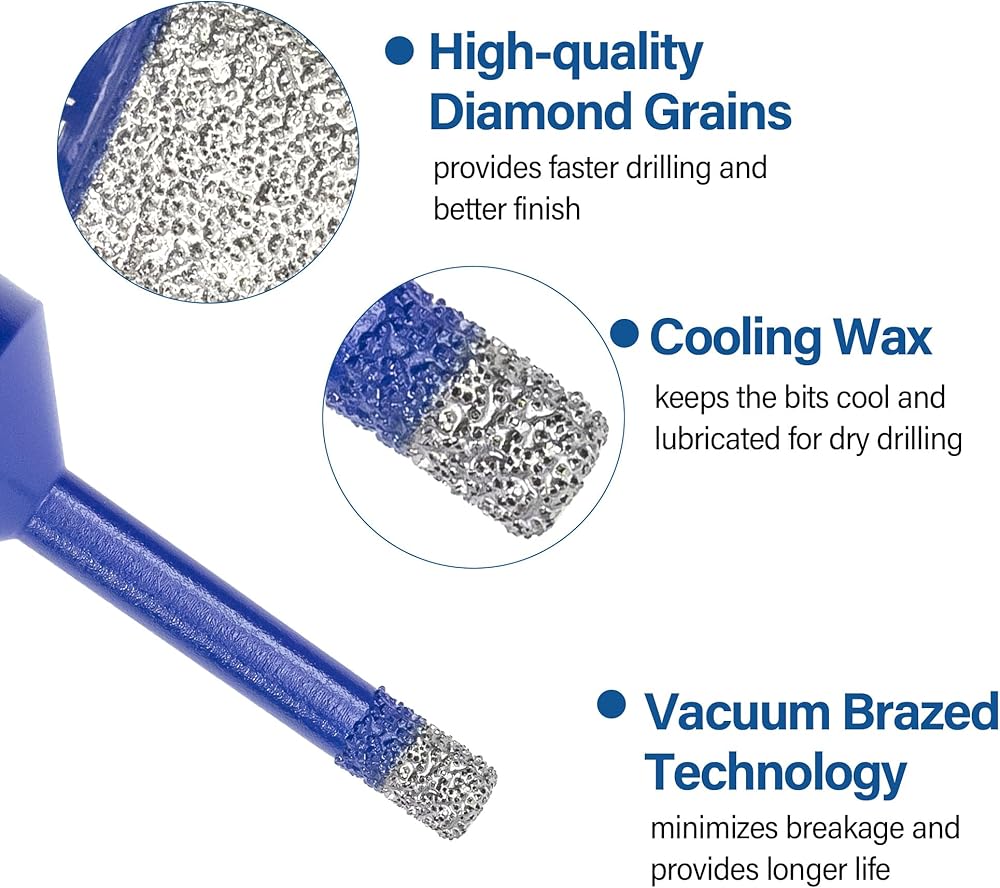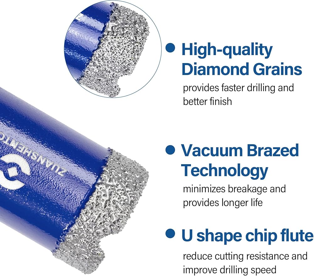 تقنية الماس النحاسي المفرغ: قطع الماس المثقوبة مصنوعة من كربيد التنجستن والماس عالي الجودة، وهو أثقل وأكثر مقاومة للتآكل من قطع الماس المطلية بالكهرباء، مما يجعل الحفر والطحن سريعًا جدًا.