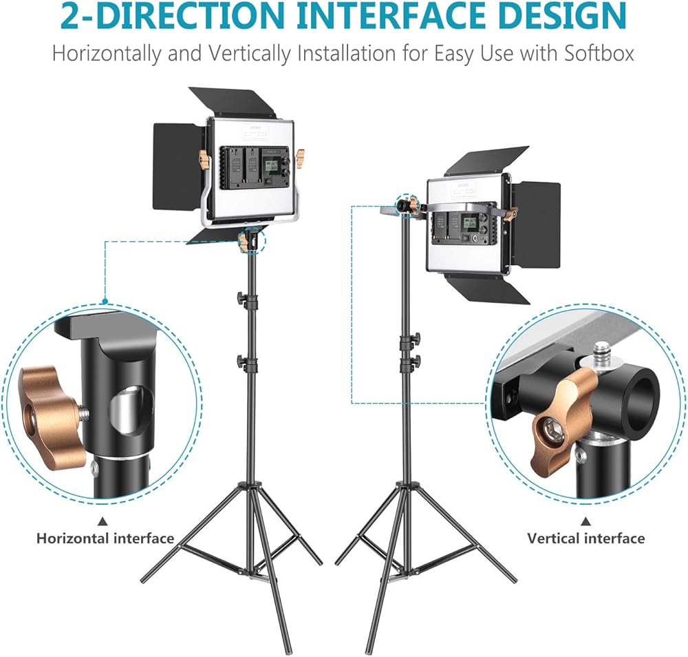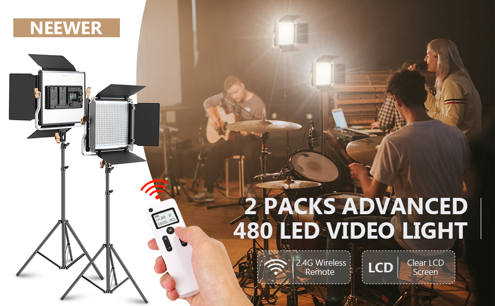 Kit Includes: (2)Bi-color 480 LED Video Light with U Bracket and Barndoor, (2)White Diffuser, (2)Power Adapter, (2)Power Cable, (1)2.4G Wireless Remote (Battery Not Included); (2)Carrying bag and (2)26 inches-75 inches Adjustable Light Stand