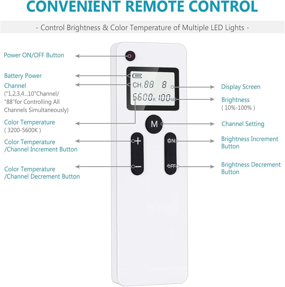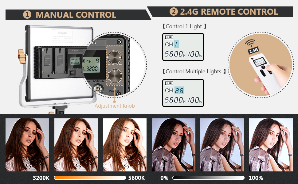 2.4G Wireless Remote Control: It can easily adjust brightness, Channel and color temperature from within 20 meters distance. Designed with 11 channels (1-10 Channel and "88" Channel) and with the remote control, this light allows you to control one 480 light or control multiple 480 lights at the same time by setting the channel No. of the remote as "88" to achieve more creative work