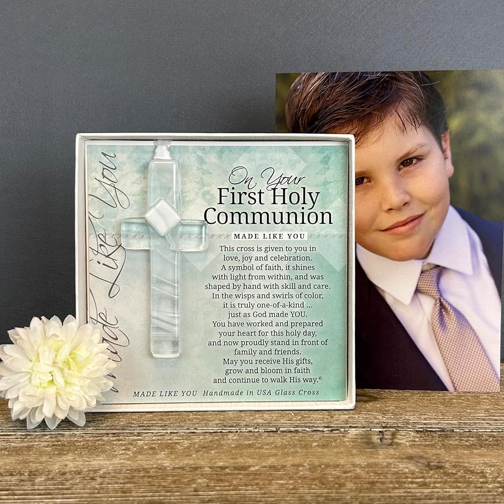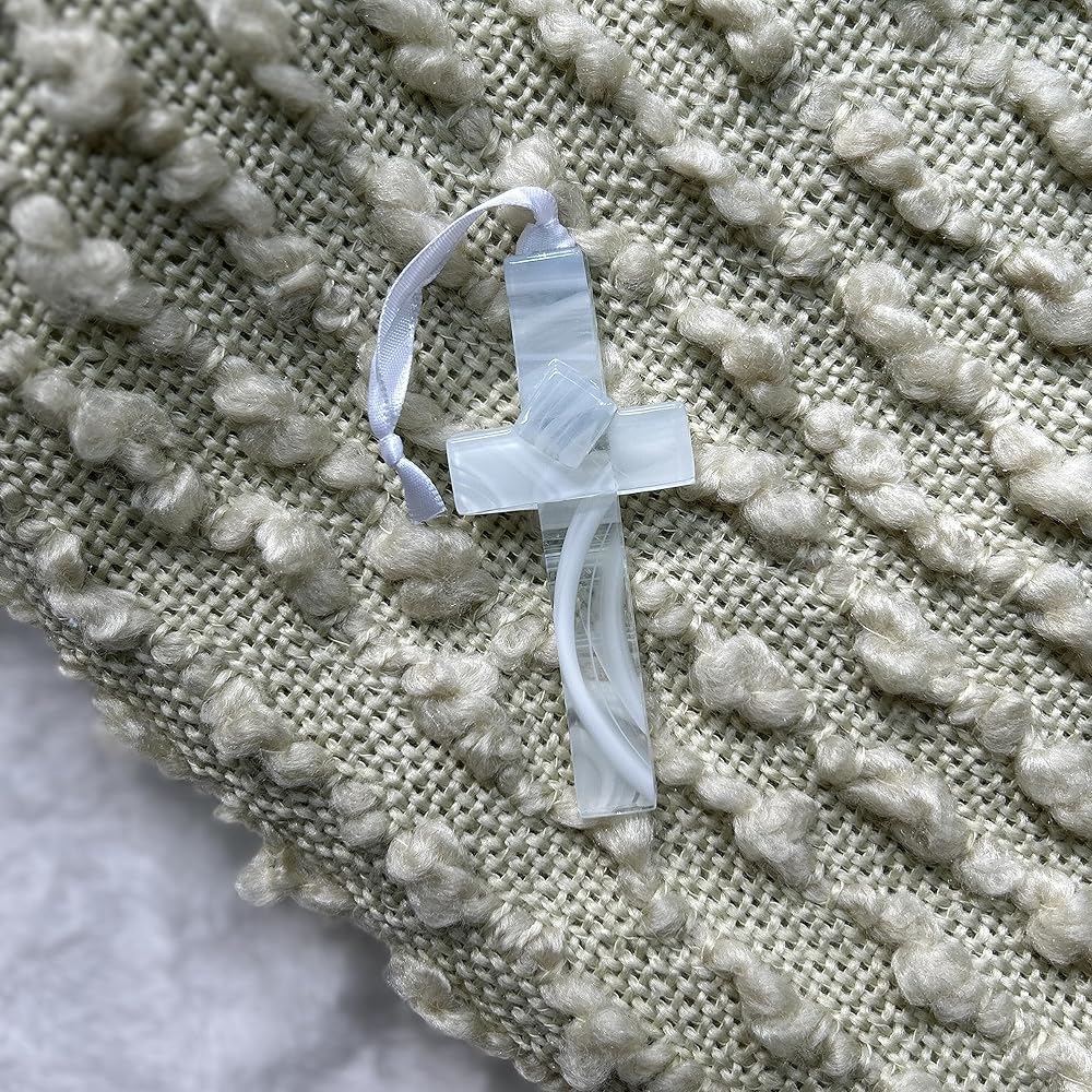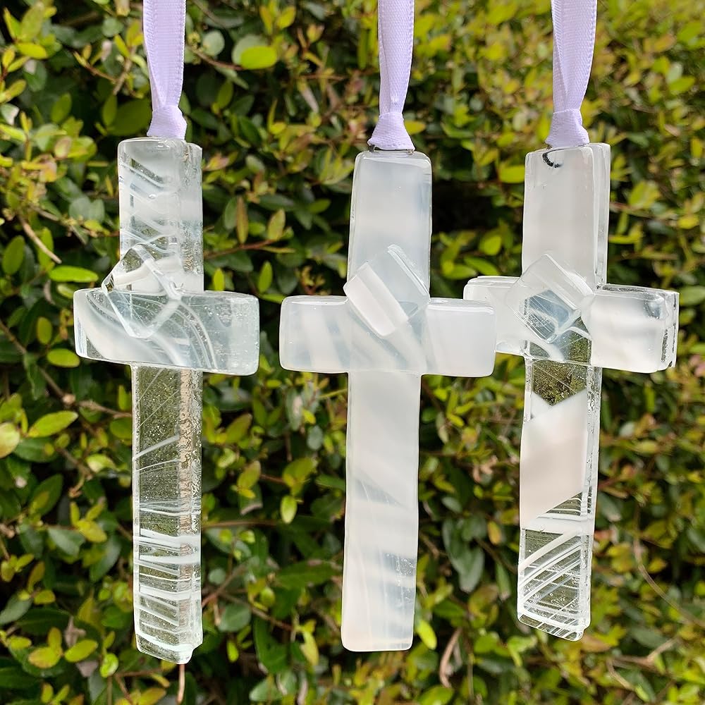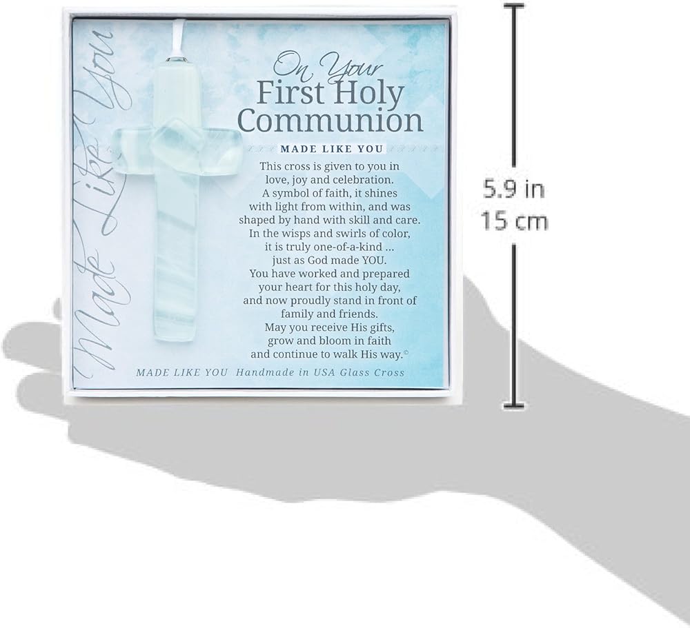 يأتي صليب التأكيد المعبأ للأولاد في صندوق 5.5 انش × 5.5 انش في صندوق أبيض مع غطاء شفاف وقصيدة تأكيد حقوق الطبع والنشر تيري هاريسون. مصنوع يدويًا في الولايات المتحدة الأمريكية من الزجاج الأزرق قياس انش ويتم تعليقه على شريط ساتان أبيض للعرض على مدار العام.