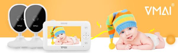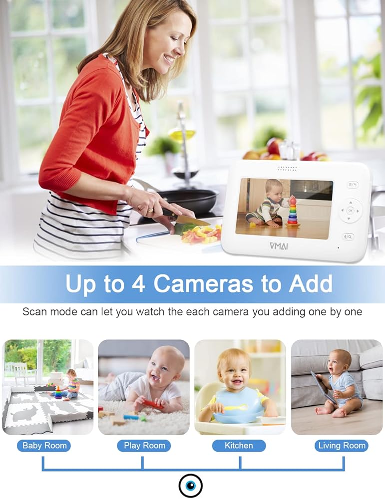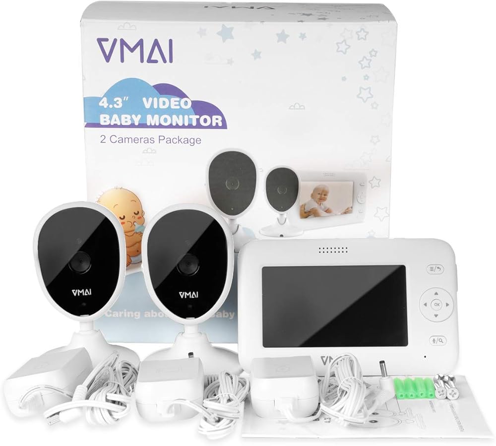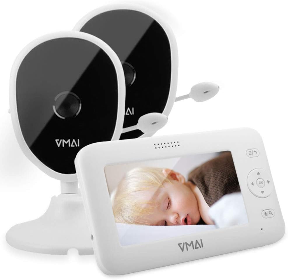 جهاز مراقبة الطفل، جهاز مراقبة الطفل بالفيديو مقاس 4.3 بوصة مع كاميرتين، رؤية ليلية، مراقبة درجة الحرارة، 5 تهويدات، محادثة ثنائية الاتجاه، وضع VOX، منبه لوقت التغذية، يدعم ما يصل إلى 4 كاميرات، ناقل حركة ثابت بطول 1000 قدم