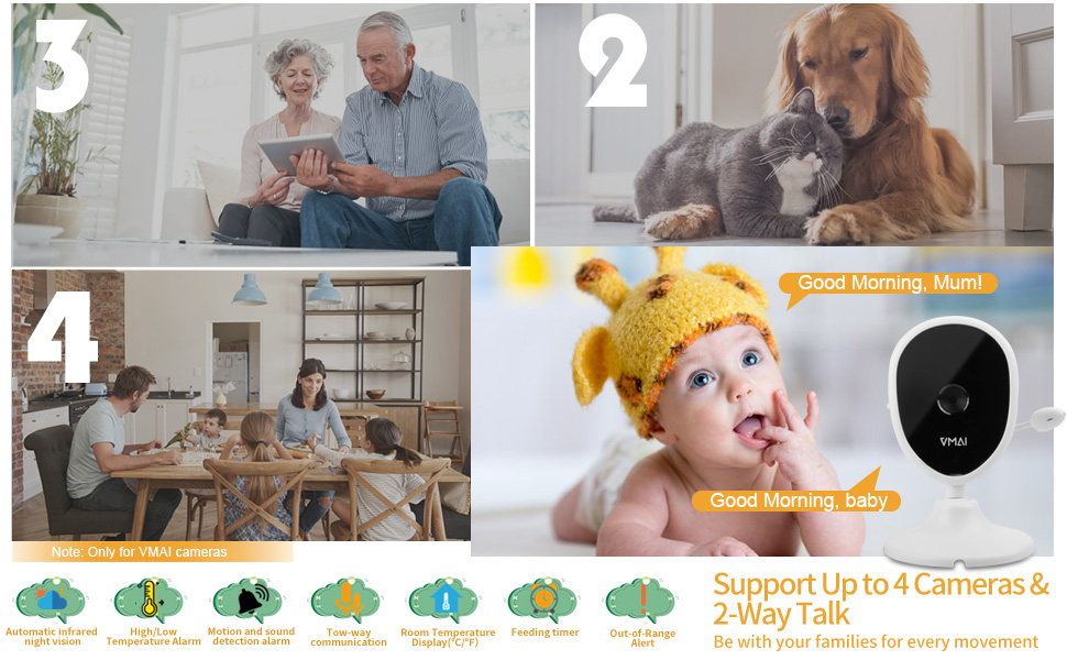 ❤【اختيار أفضل مع كاميرتين】اختيارك الأفضل لحزمة كاميرتين إذا كان لديك طفلان! ويدعم ما يصل إلى 4 كاميرات في نفس الوقت. توفير أموالك وإعطاء القدرة على مراقبة الطفل الثاني أو المسن أو الحيوان الأليف أو أي شخص آخر تهتم به في نفس الوقت. يمكن للبطارية ذات السعة العالية أن تدوم لمدة 5 ساعات في وضع عرض الصور.