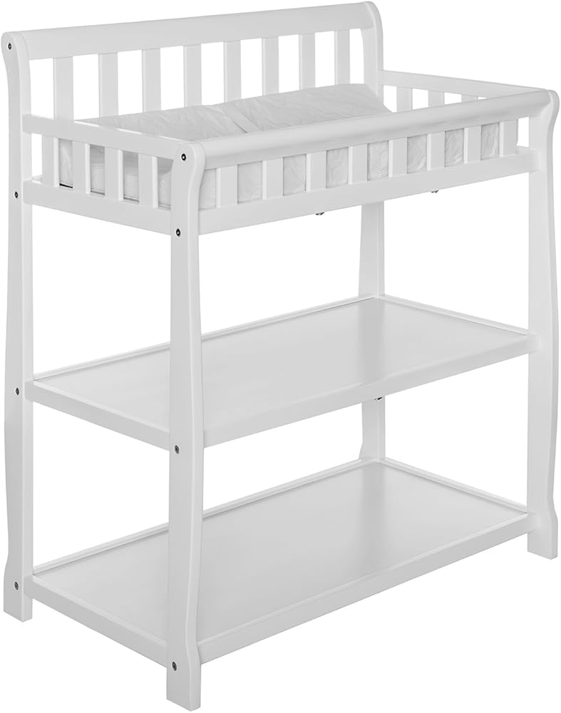 • FUNCTIONAL & SECURE: Don't worry about a mess during changing time as it comes with a water-resistant mattress pad. With safety rails on four sides the changing table is a fully enclosed & secure space; there's also a safety strap for keeping baby secure. Also, 1 inch mattress pad is included.